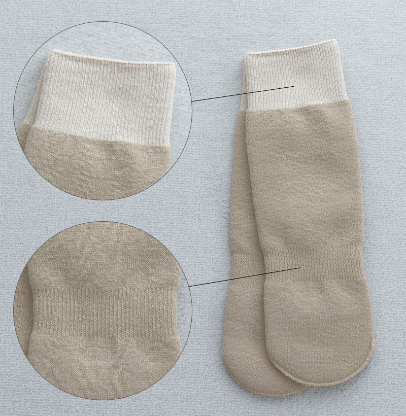 ワンサイズでも、夫婦や親子の足にフィットかかとがない筒状のソックスは、男女兼用で履けるのがポイント。子どもも履きやすい形です