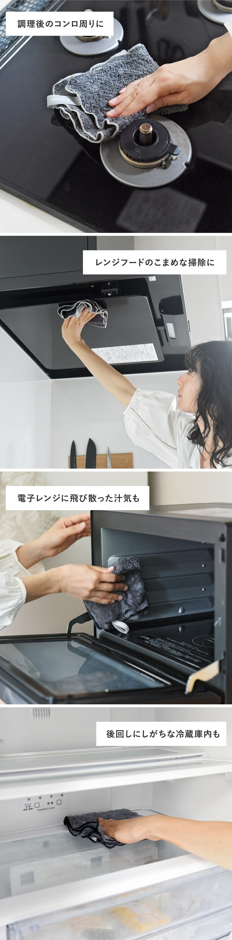 絡め取った油は水ですすげばスルッと落ちるから、コンロやコンロ周りの壁、電子レンジの庫内もこれ一枚できれいに拭き上げられます。