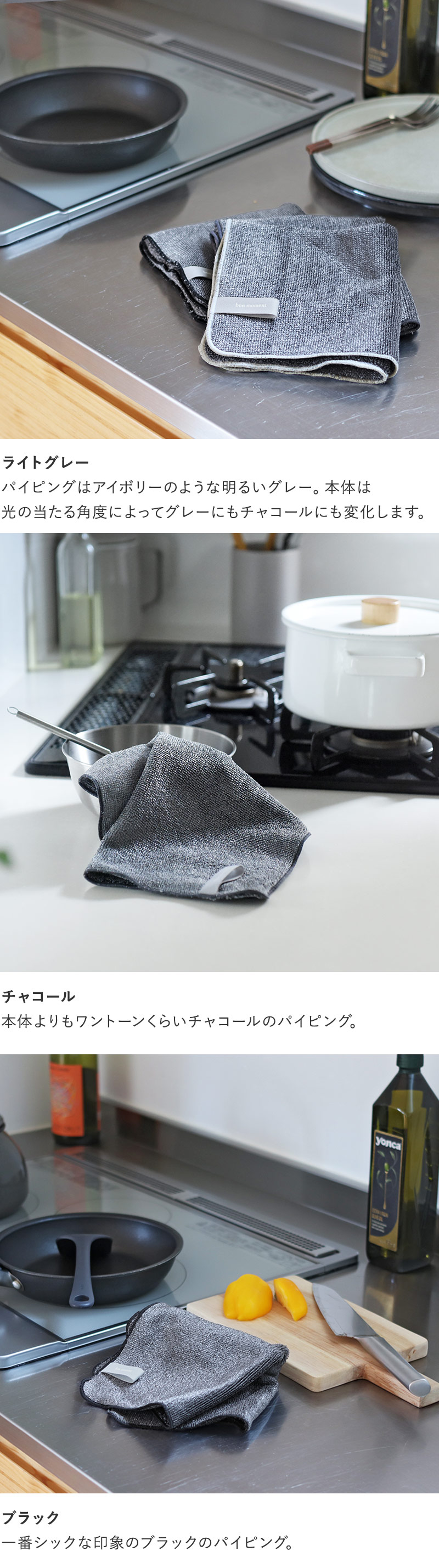 汚れ落ちが良いとは言っても、やっぱりお掃除クロスは色が濃い方が気兼ねなく使えそう。そんな想いからアンジェ別注でチャコールの生地を生産していただきました。パイルのカラーはライトグレー、チャコール、ブラックをご用意。