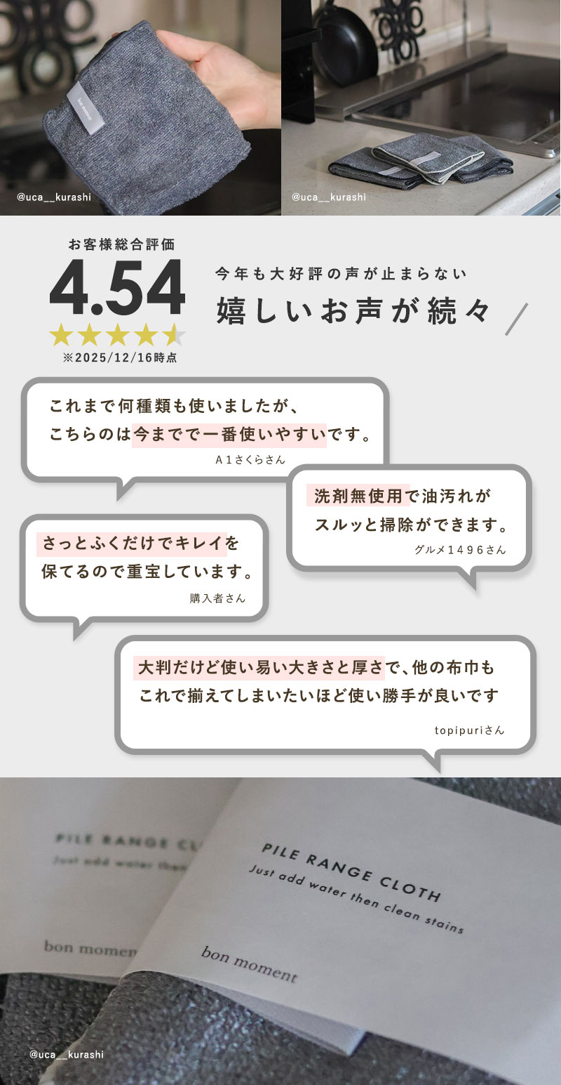 パイルレンジクロスなら洗剤なしでしっかりと汚れを絡め取るから、日々の油汚れがサッと簡単に落とせます。