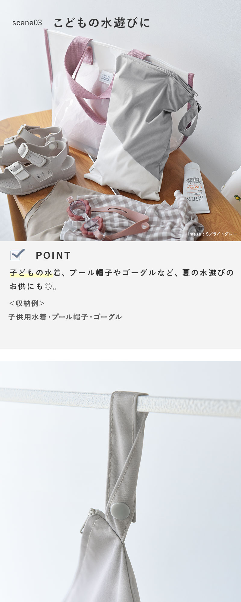 折り畳み傘やタオルにハンカチ、夏場のクールタオルや水遊びアイテムなど細かなものをいれやすいサイズ感に仕上げました。