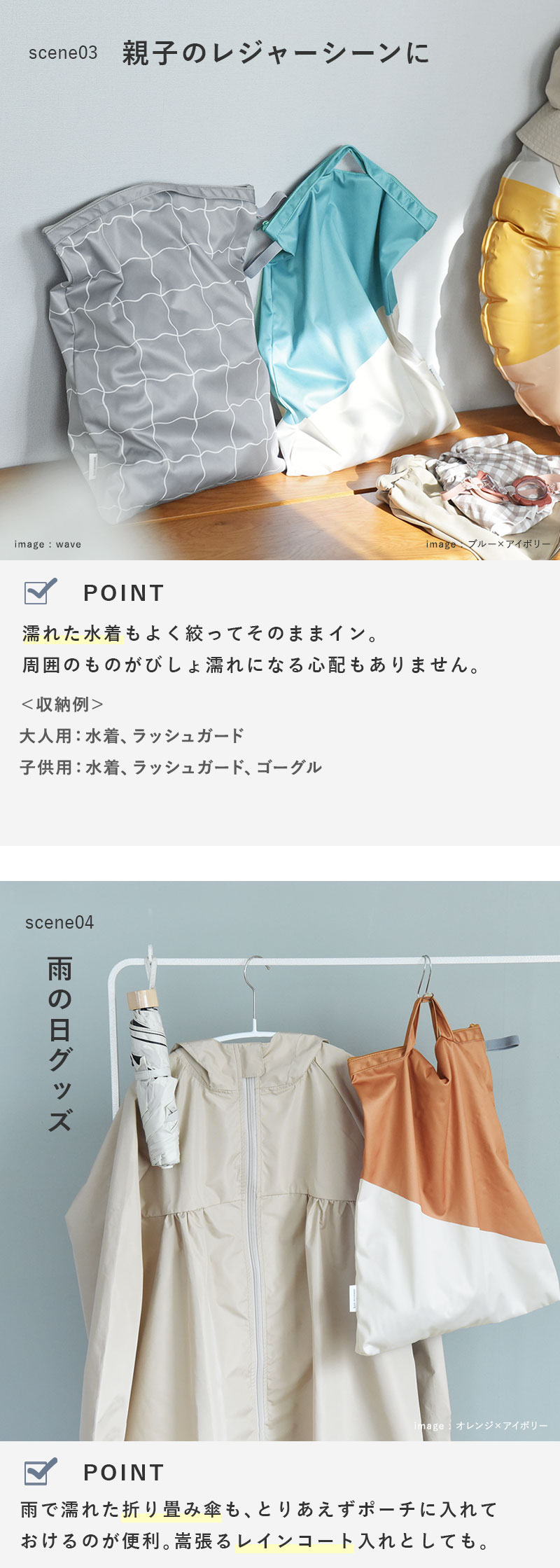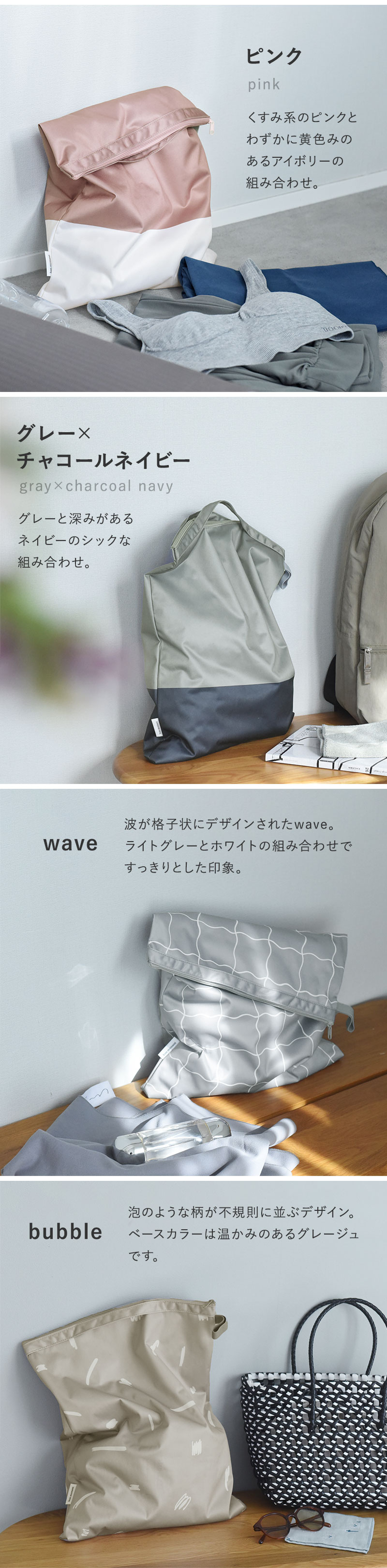 濡れ物だけではなく乾きものも入れられるので、旅行のオーガナイザーして使ってもOK。着用後の洋服を詰めれば、バッグの中を清潔なまま持ち帰れます。