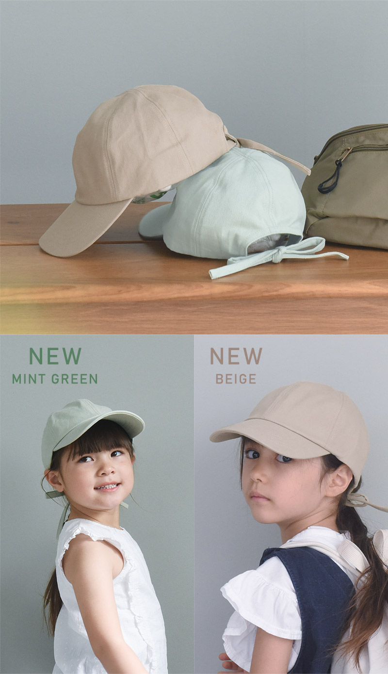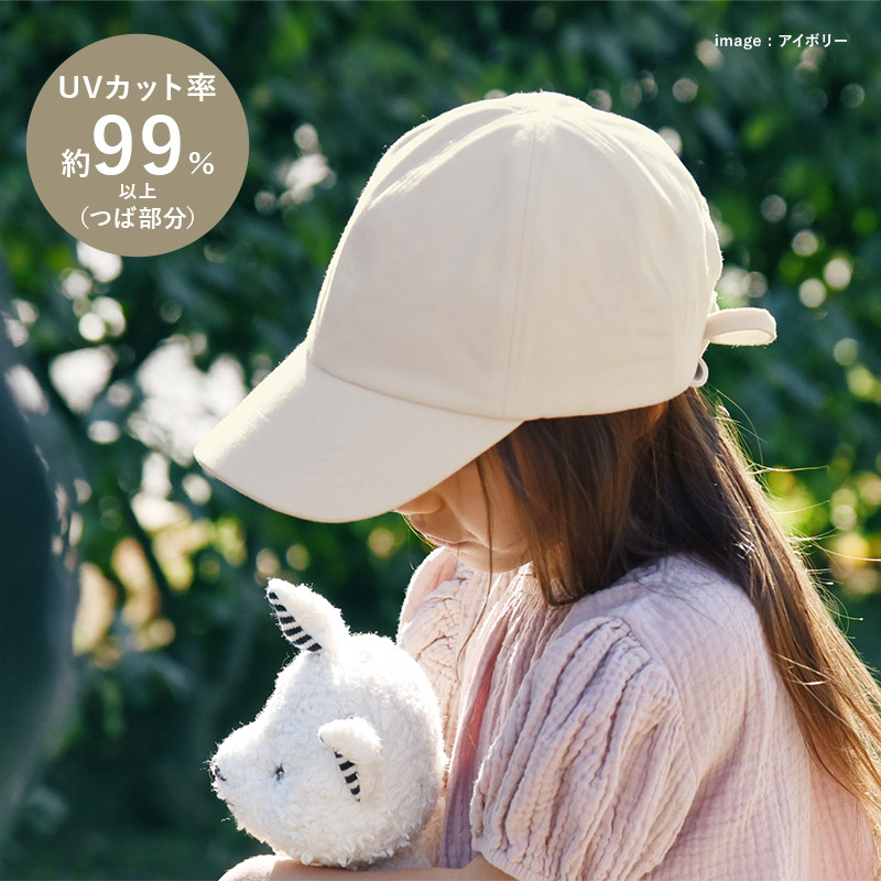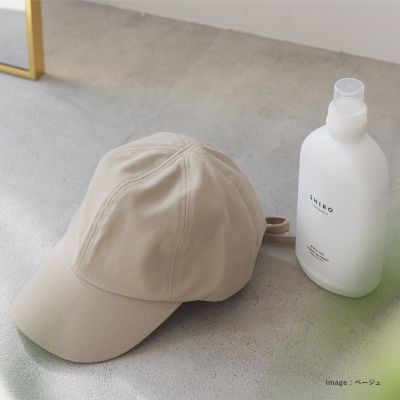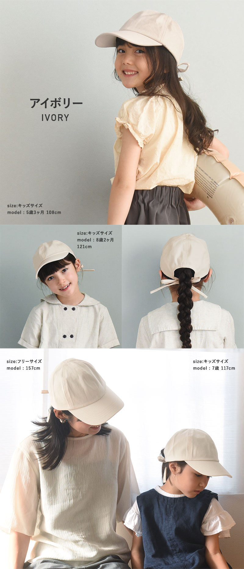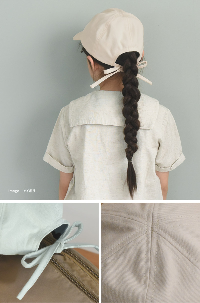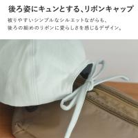 キャップ全体は被りやすいシンプルなシルエットながらも、後ろの細めのリボンに愛らしさを感じるデザイン。本体と同色にすることで、甘過ぎない印象に仕上げています。