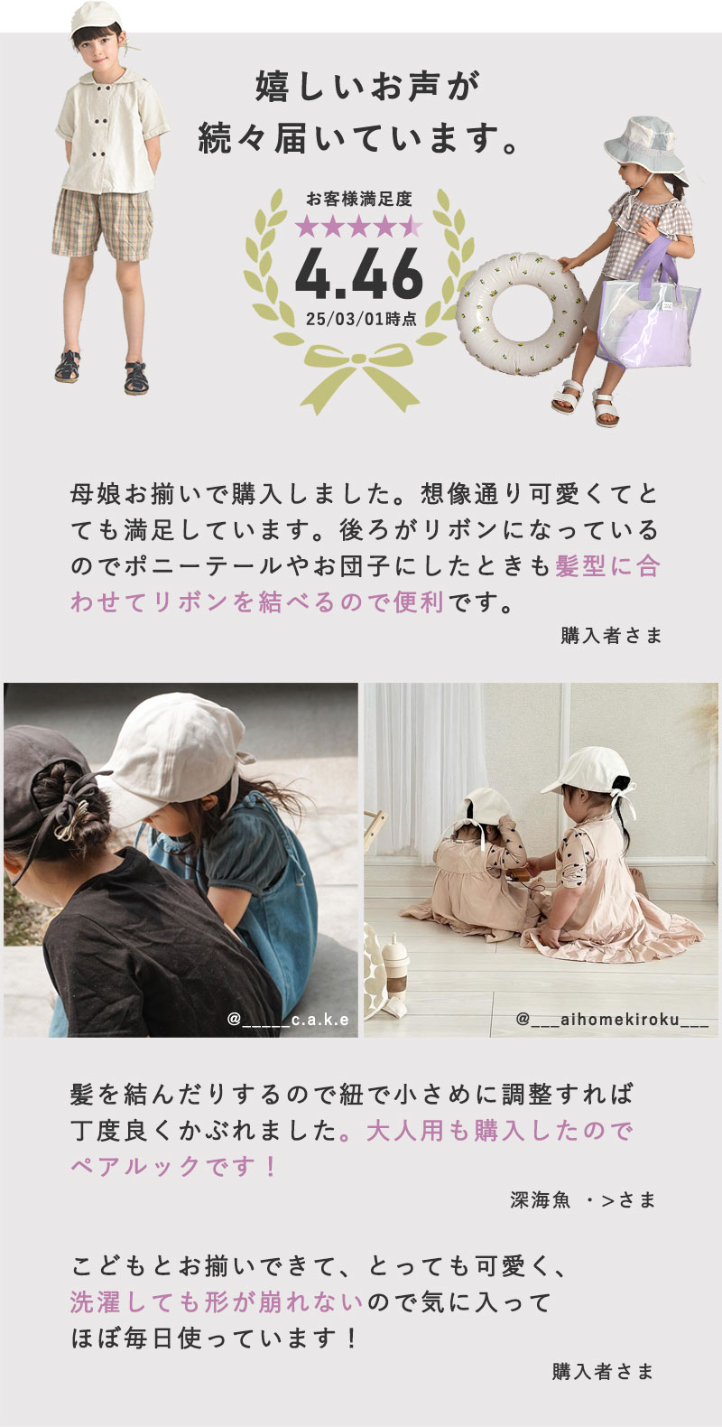 リボンの結び目でサイズ調整ができるため、比較的長く愛用いただけます。キッズサイズ、フリーサイズの2サイズ展開なので、親子でリンクコーデや姉妹でのペアコーデも◎。