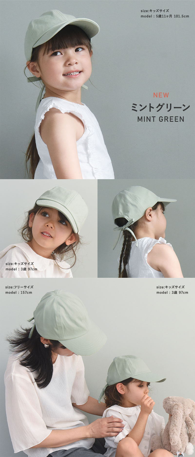 後ろリボンの結び目でサイズ調整も楽ちんに、キッズサイズとフリーサイズの2サイズ展開だから、親子リンクや姉妹ペアも◎です。