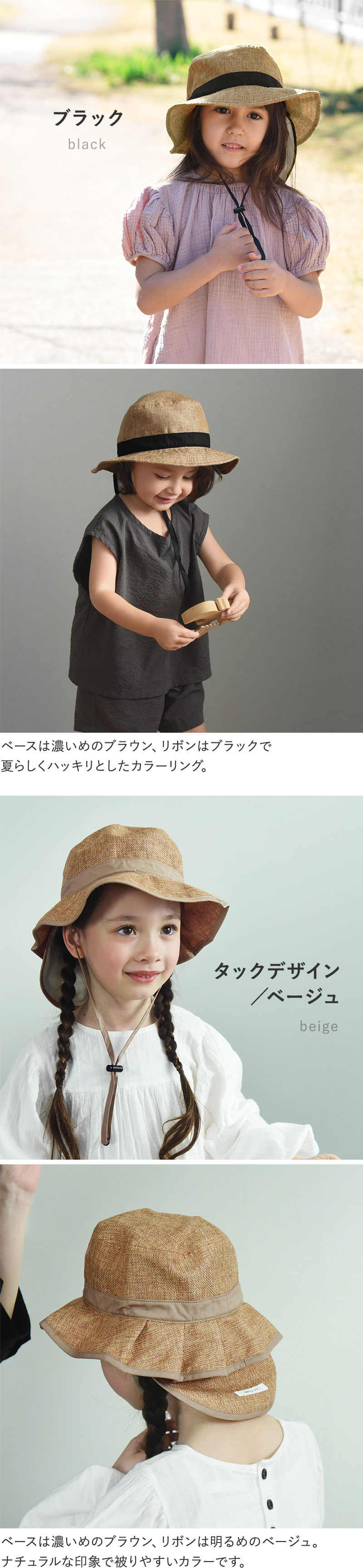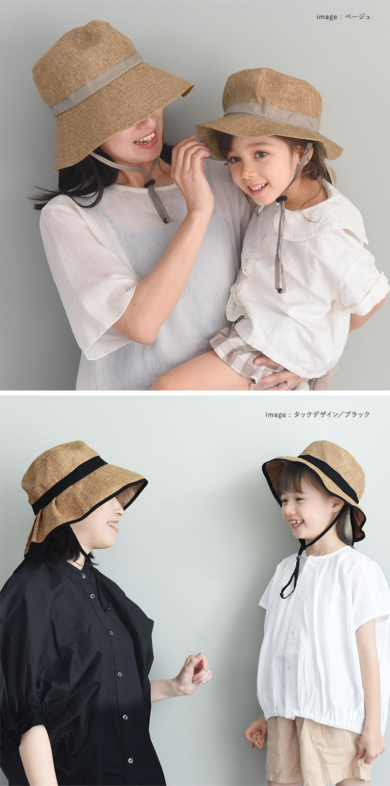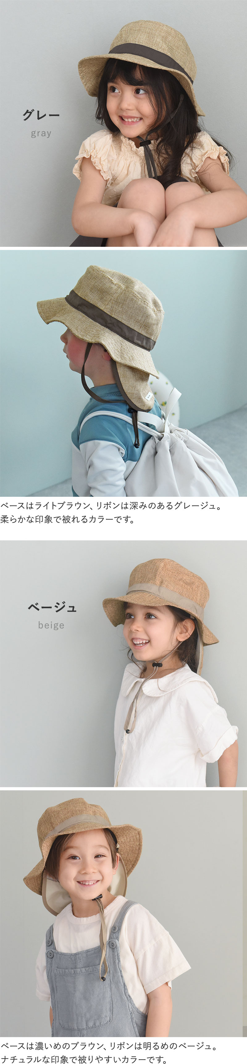 「大人のジュート風帽子」と同じ素材を使用しているので、親子でお揃いコーデをすることも。同じ色で揃えるのもよし、違う色で楽しむのも◎です。