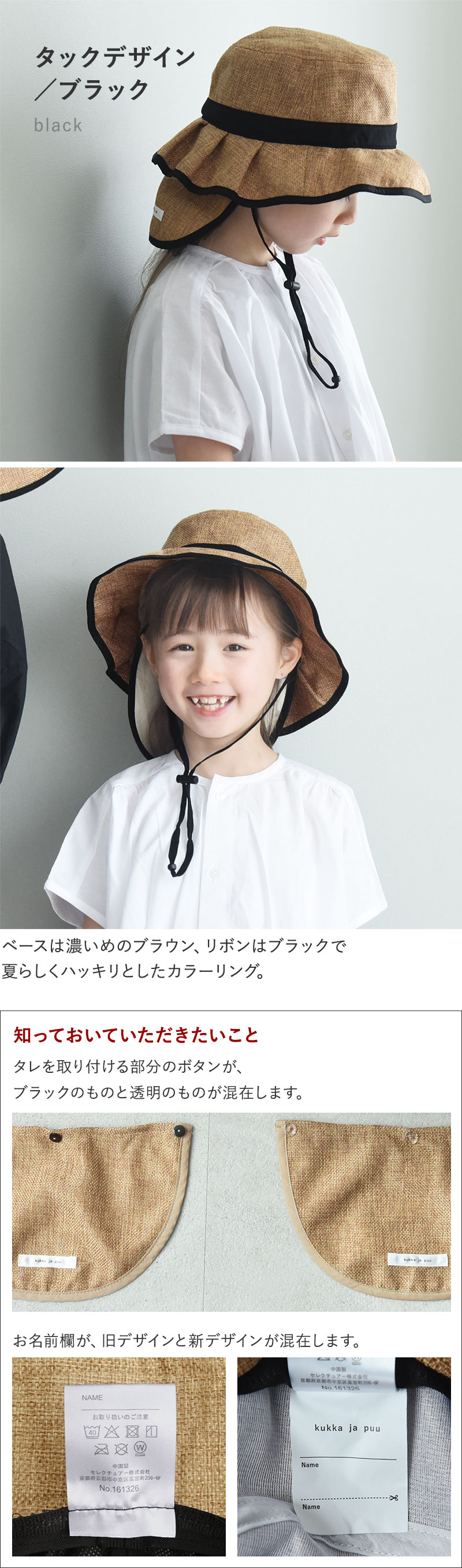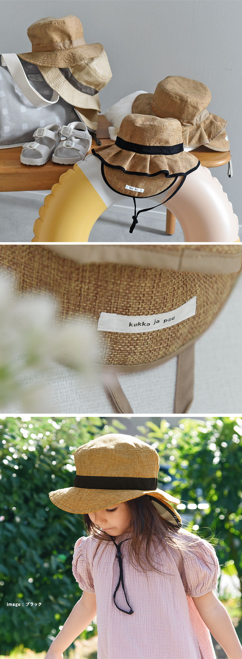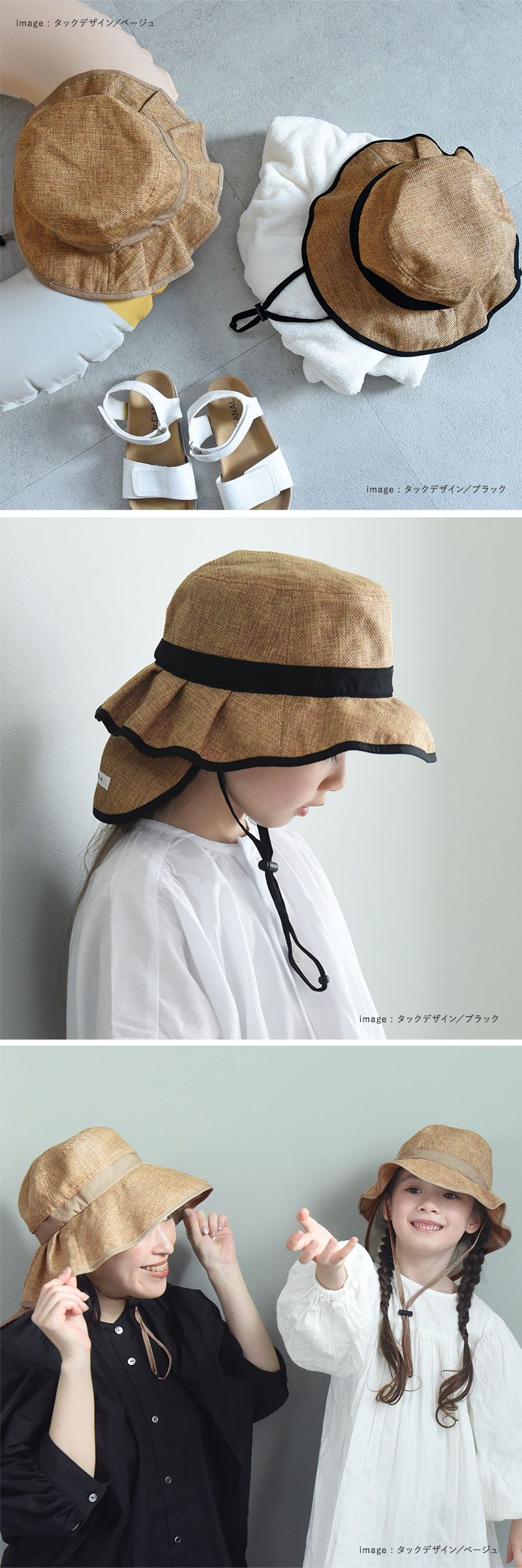 「大人のジュート風帽子」と同じ素材を使用しているので、親子でお揃いコーデをすることも。同じ色で揃えるのもよし、違う色で楽しむのも◎です。
