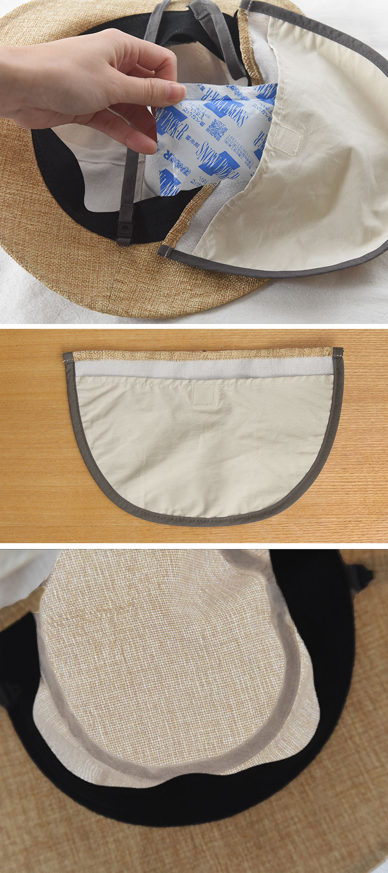 日よけタレと保冷剤ポケットが一体化。開け閉めしやすい面テープ仕様のポケットで、スムーズに保冷剤を入れられます。