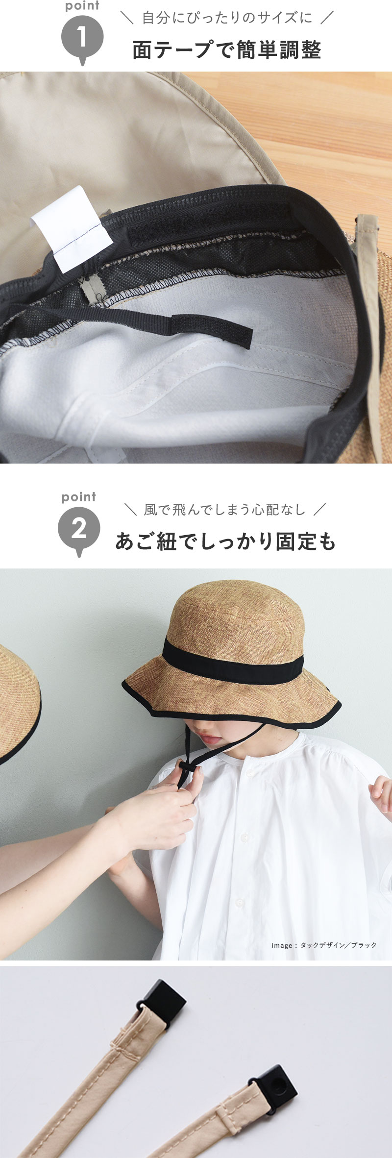 テープやあご紐、日よけタレ部分のパイピングで配色を利かせています。