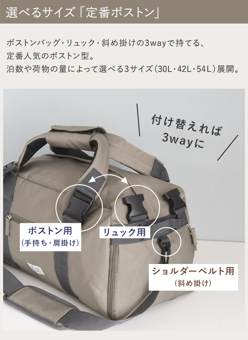 ボストンとリュック、ショルダーの3wayで使えるのがポイント。他のリュックを背負う時にはボストンバッグとして、両手を開けたい時や、荷物が重い時はリュックやショルダーバッグに。シーンに合わせて使い分けができます。