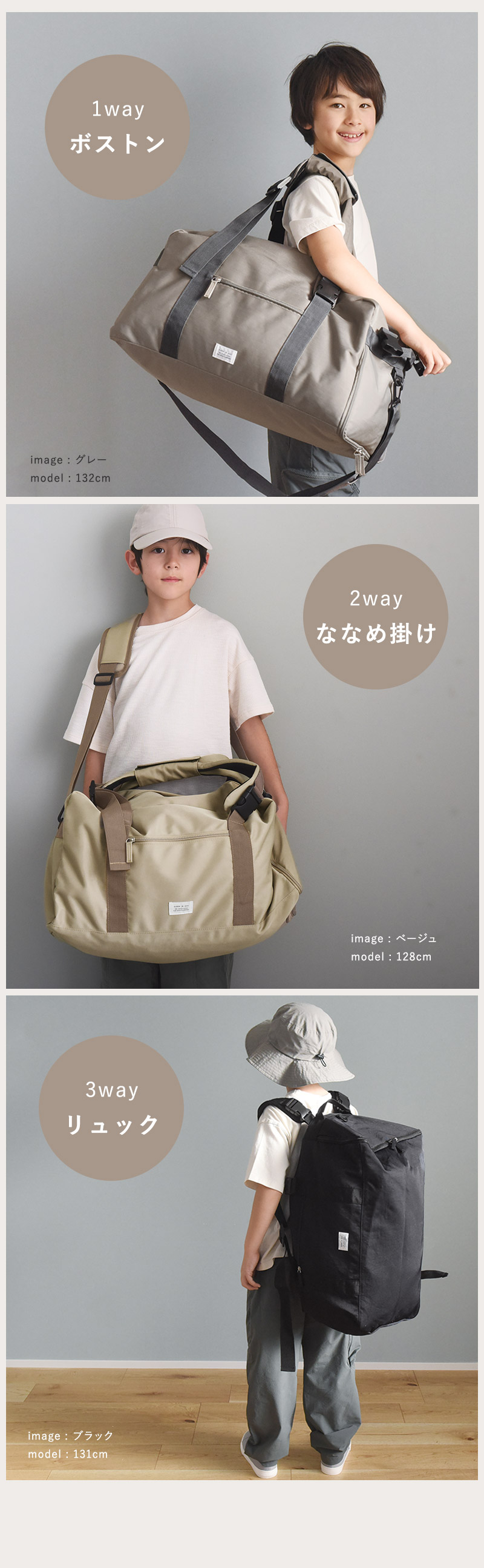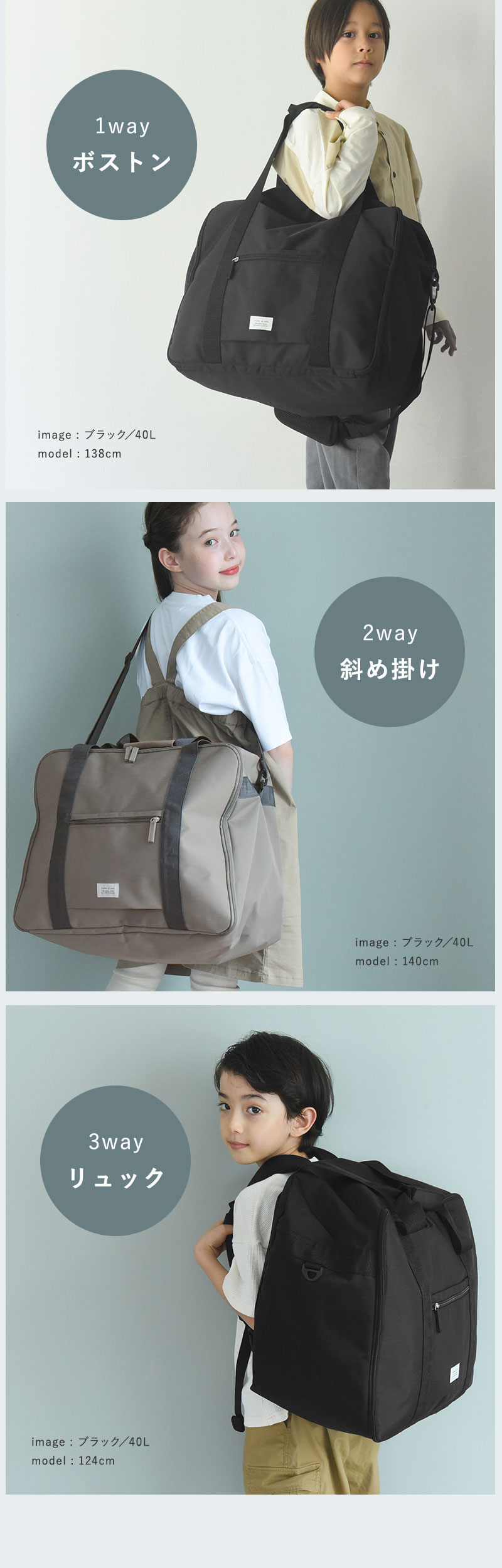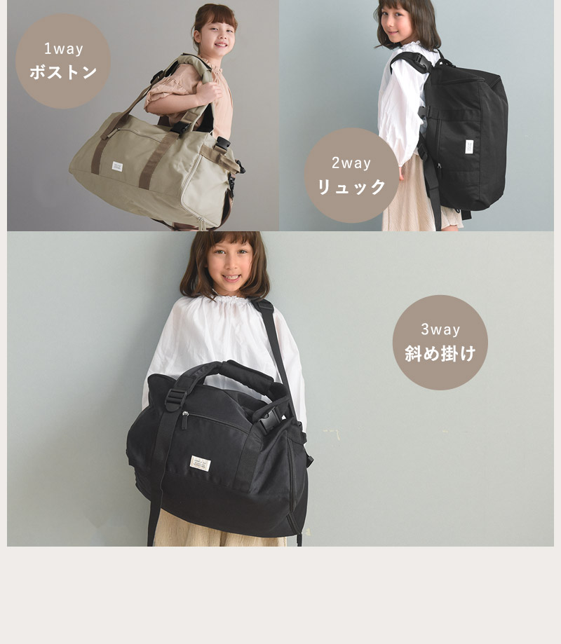 林間学校や修学旅行、合宿、キャンプにも。お子さまの旅行やお出かけで必要な荷物を詰めるのに、たっぷりサイズ感の3wayバッグです。