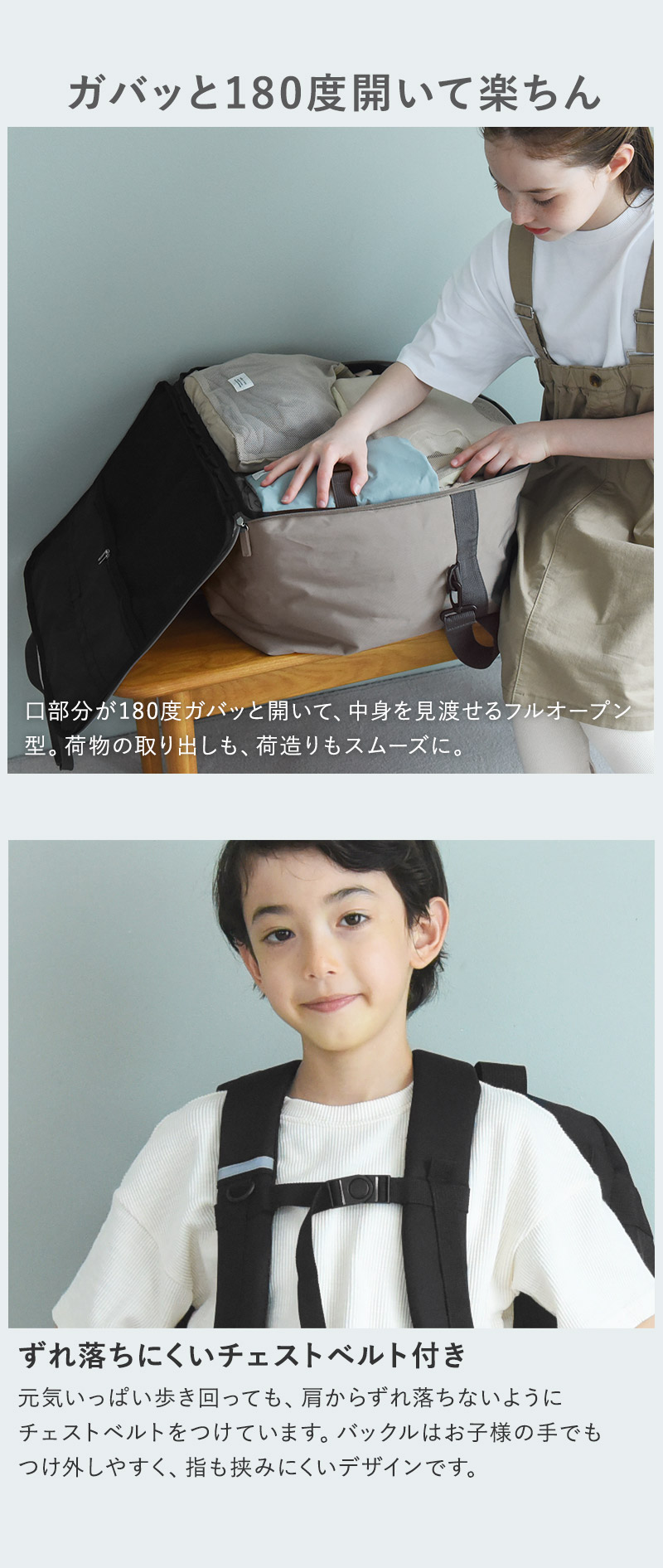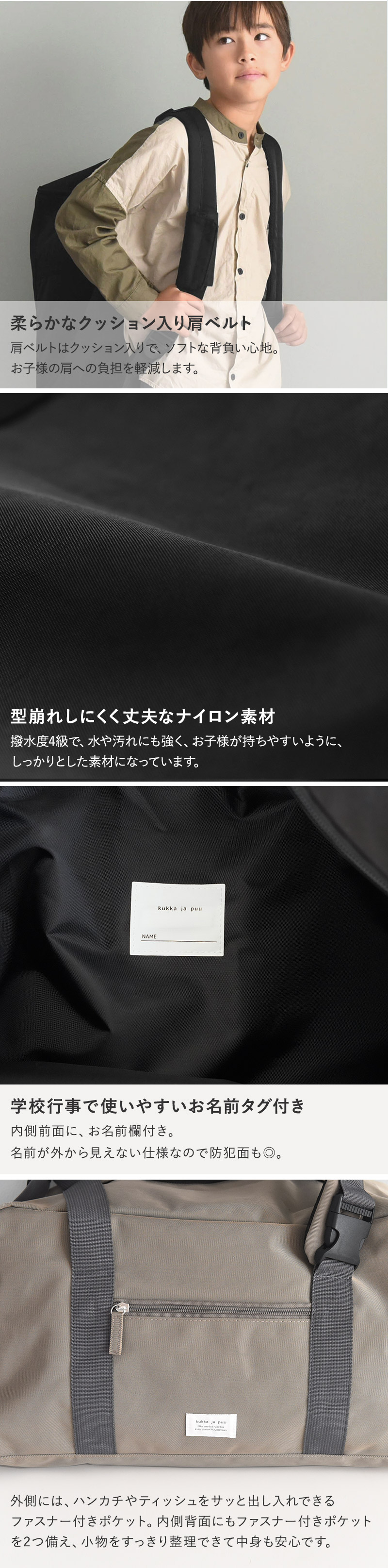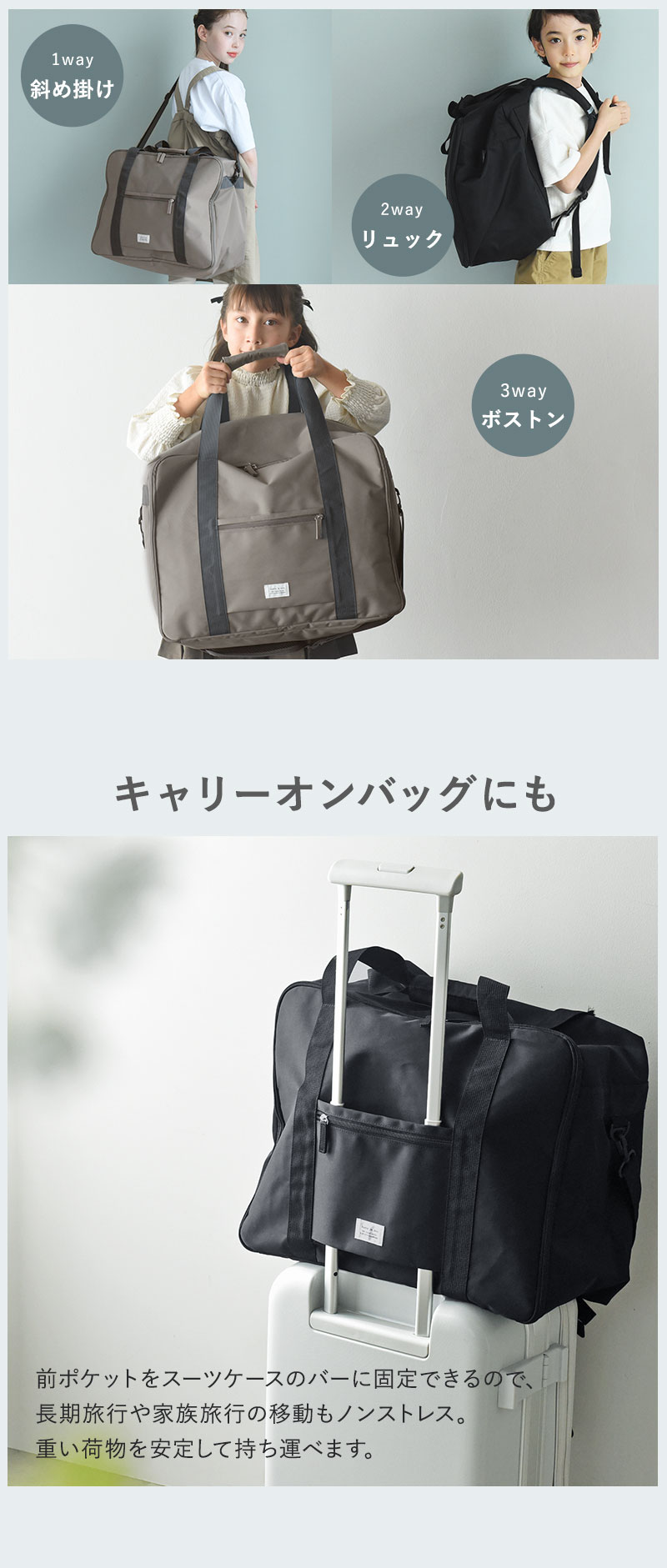 林間学校や修学旅行、合宿、キャンプにも。お子さまの旅行やお出かけで必要な荷物を詰めるのに、たっぷりサイズ感の3wayバッグです。