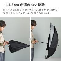 傘を開くと、親骨2本がスライドして後ろが14.5cmも延長。ランドセルやリュックを背負っていても、鞄ごと雨から守ります。