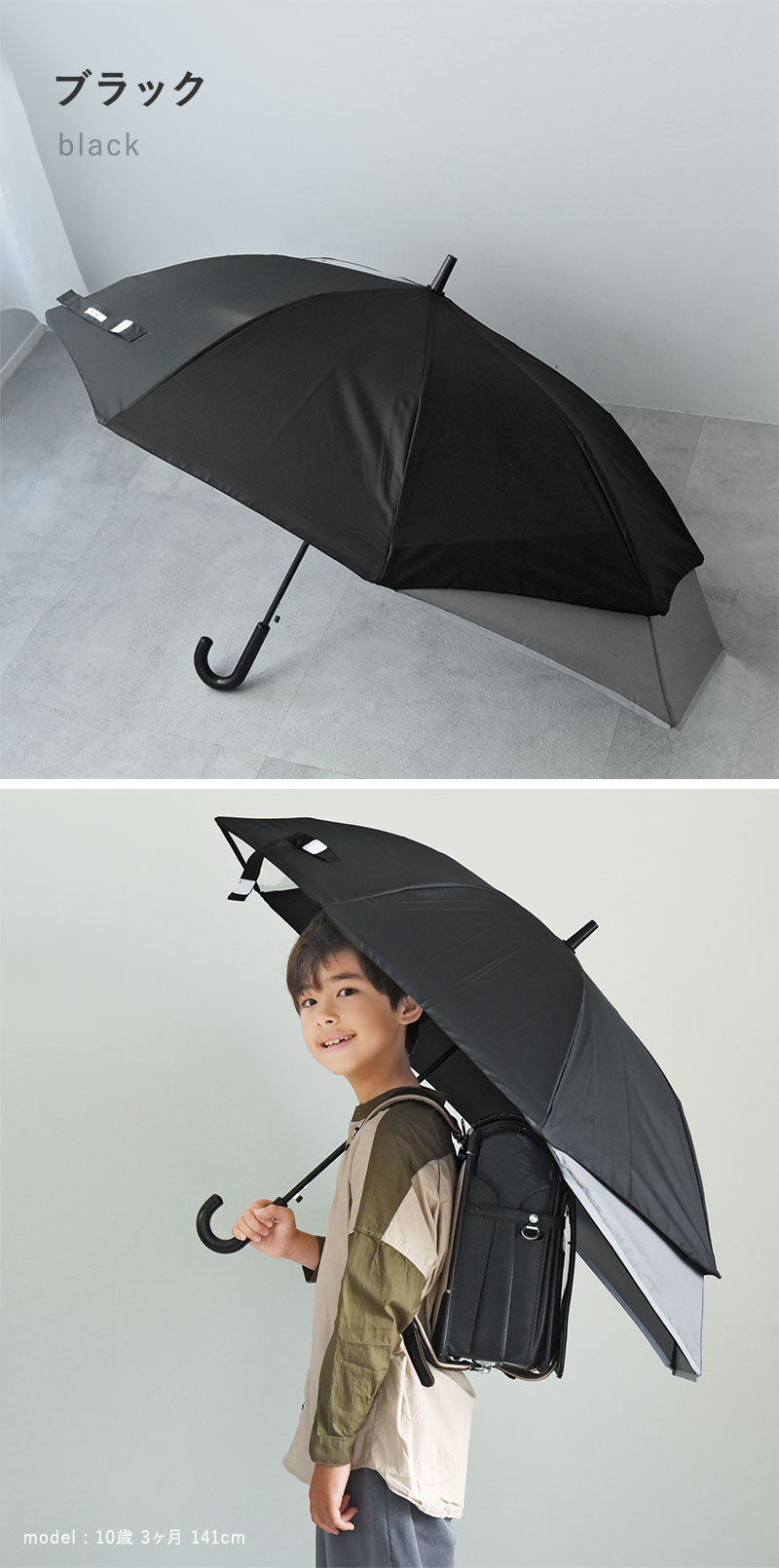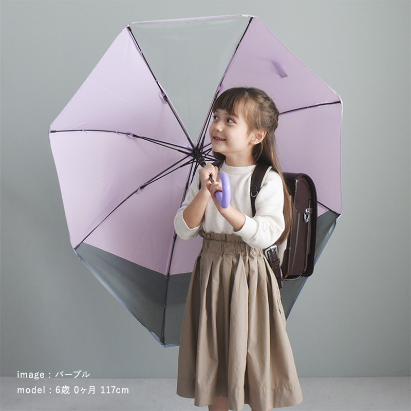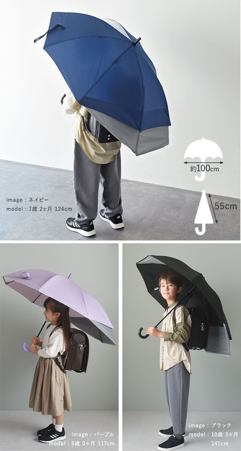 片手でパッと開けるジャンプ式の傘に、開くときに自動で後部が伸びる機能をプラス。閉じる時も普通の傘と同じ動作で、難しい操作がないので、一年生からでもお使いいただけます。
