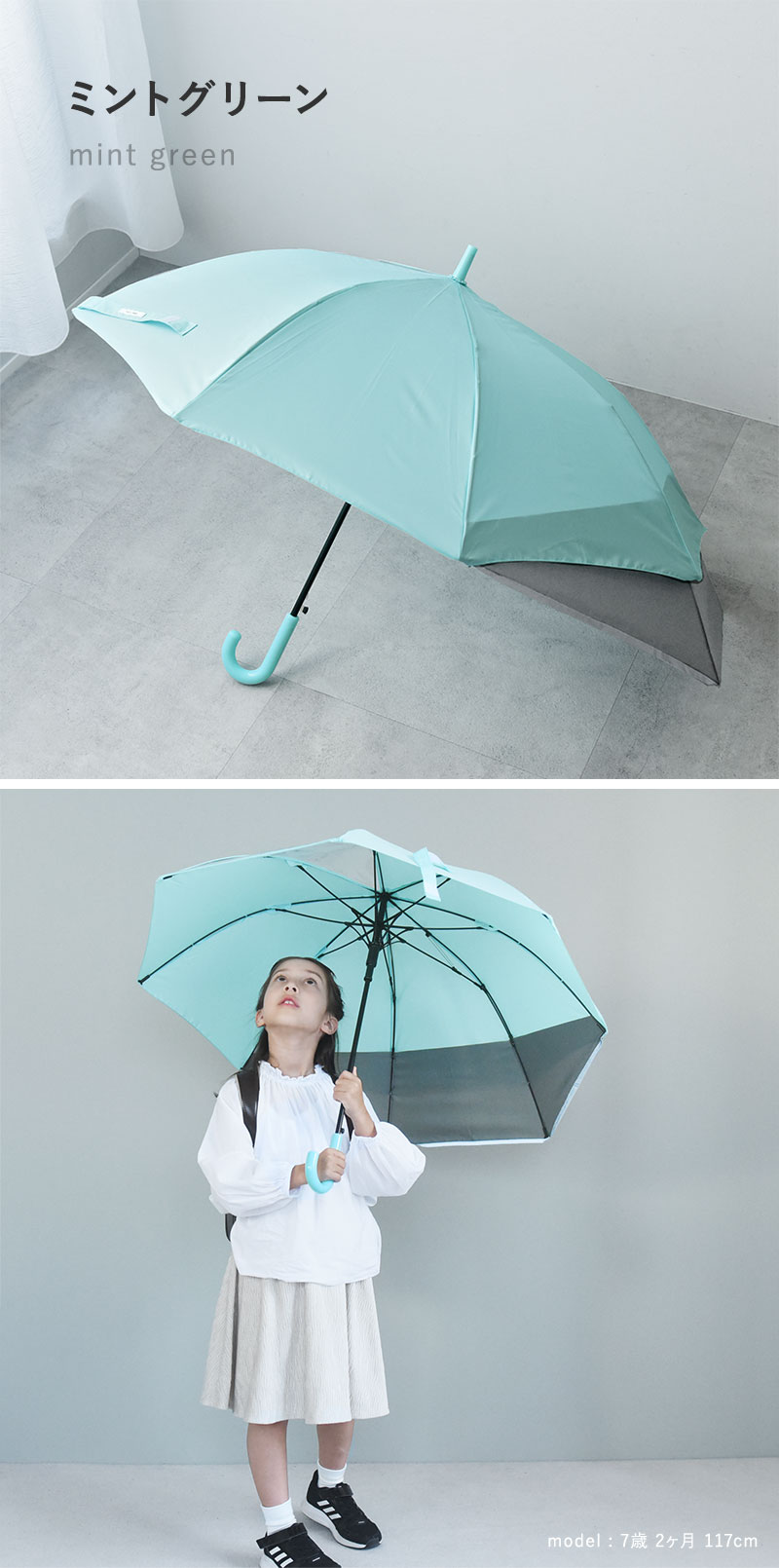 傘生地・持ち手ともに、水色にほんのりグリーンがかったような、ミントグリーン。