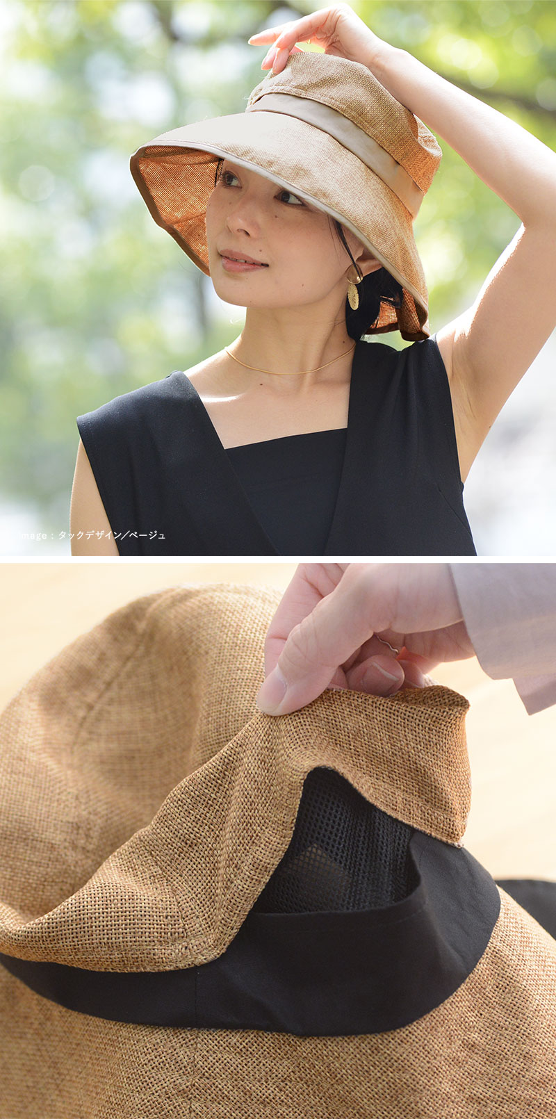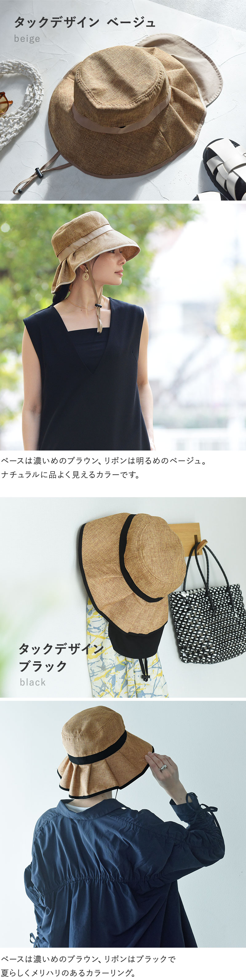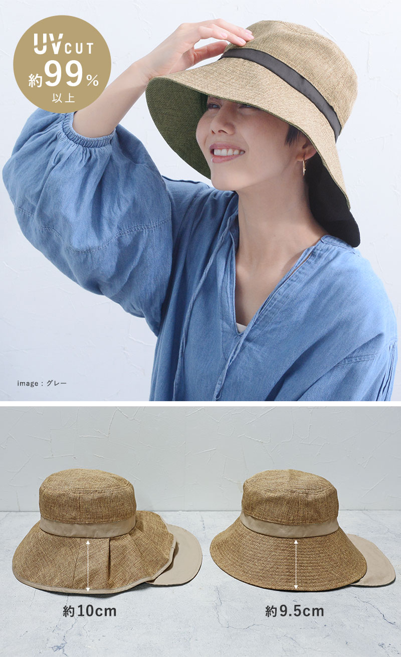 少し長めのツバ(シンプルデザイン/約9.5cm タックデザイン/約10cm)で、真夏の強い日差しをガード。やや下向きのシルエットで、嬉しい小顔効果も。