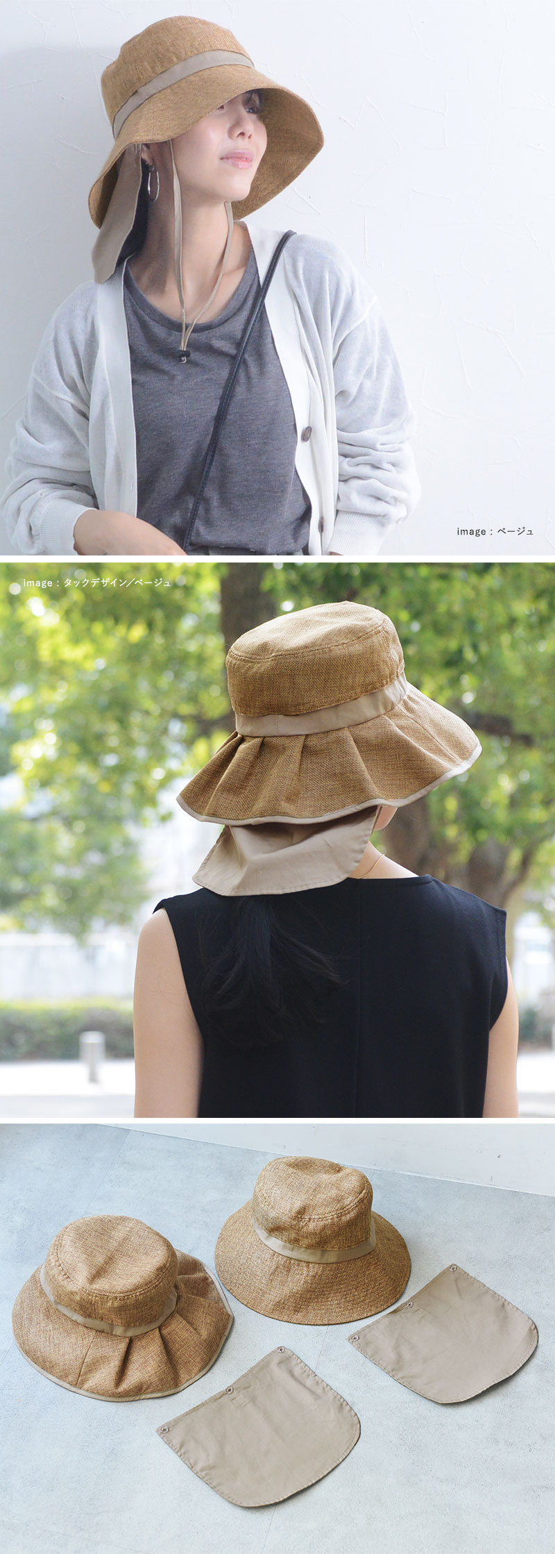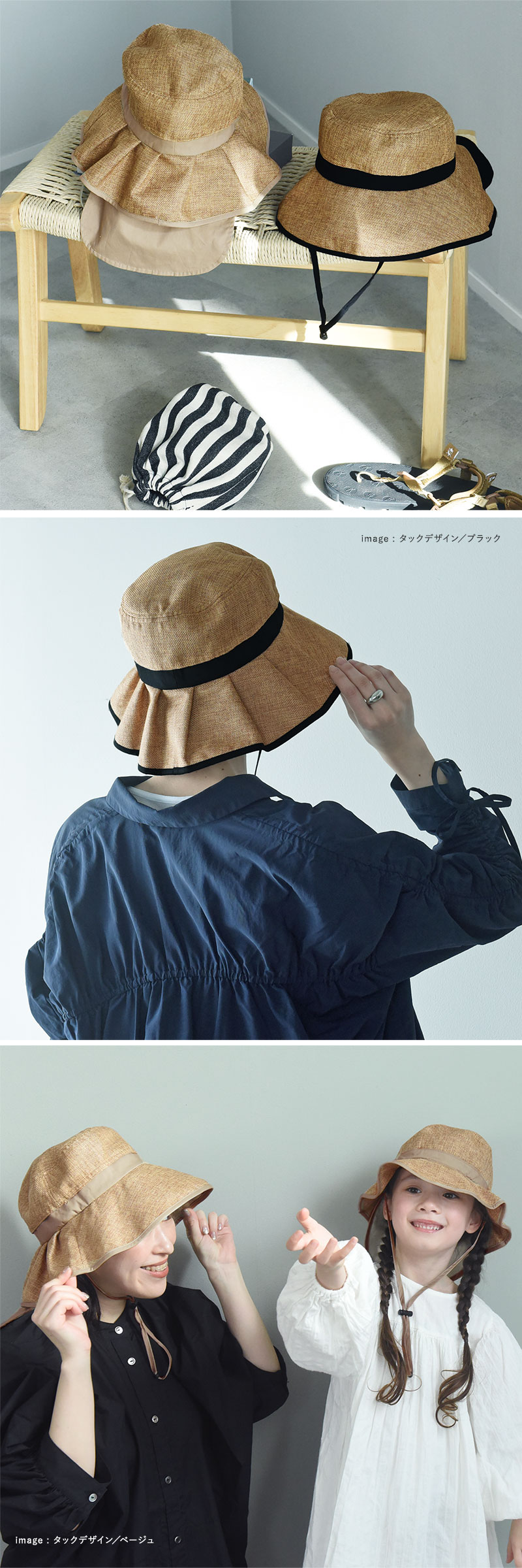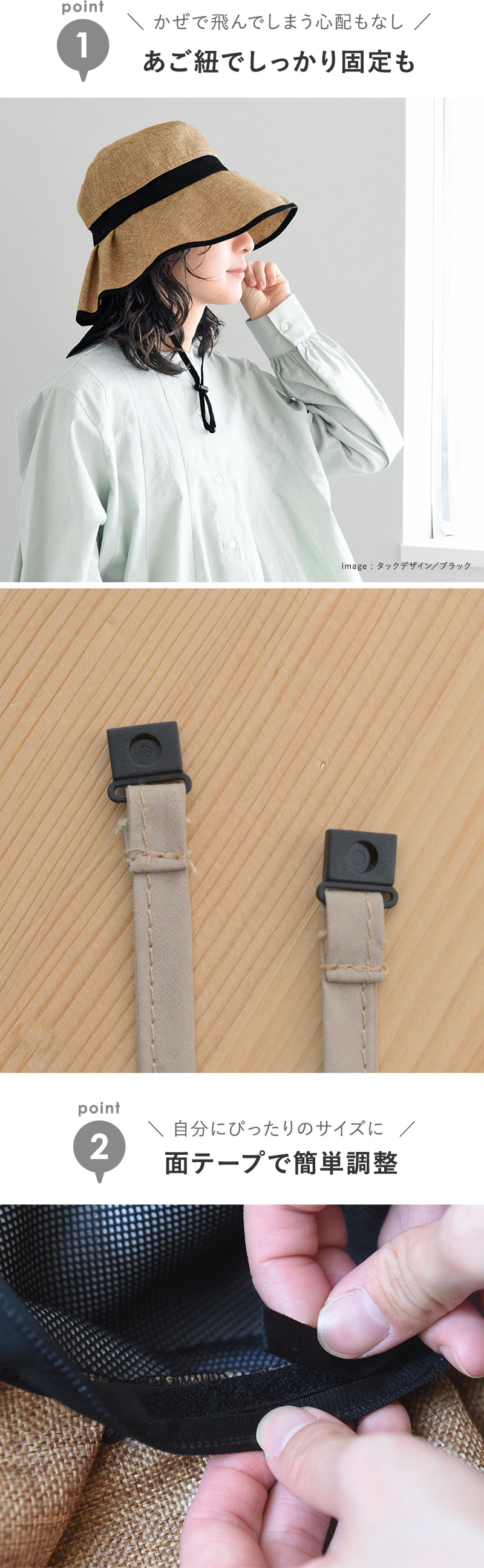 少し長めのツバ(シンプルデザイン/約9.5cm タックデザイン/約10cm)で、真夏の強い日差しをガード。やや下向きのシルエットで、嬉しい小顔効果も。