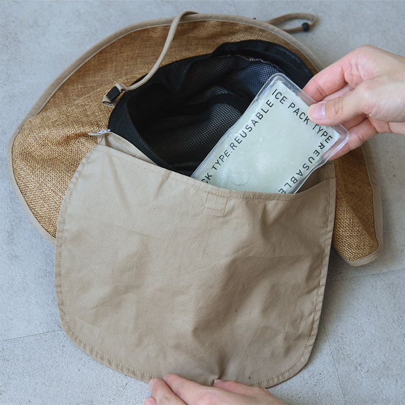 後ろには日よけのタレをつけており、焼けやすい首筋までしっかりガード。さらに保冷剤ポケットも付いていているから、首元をひんやりクールダウンができます。親子でお揃いも楽しめる、真夏のお出かけハットです。