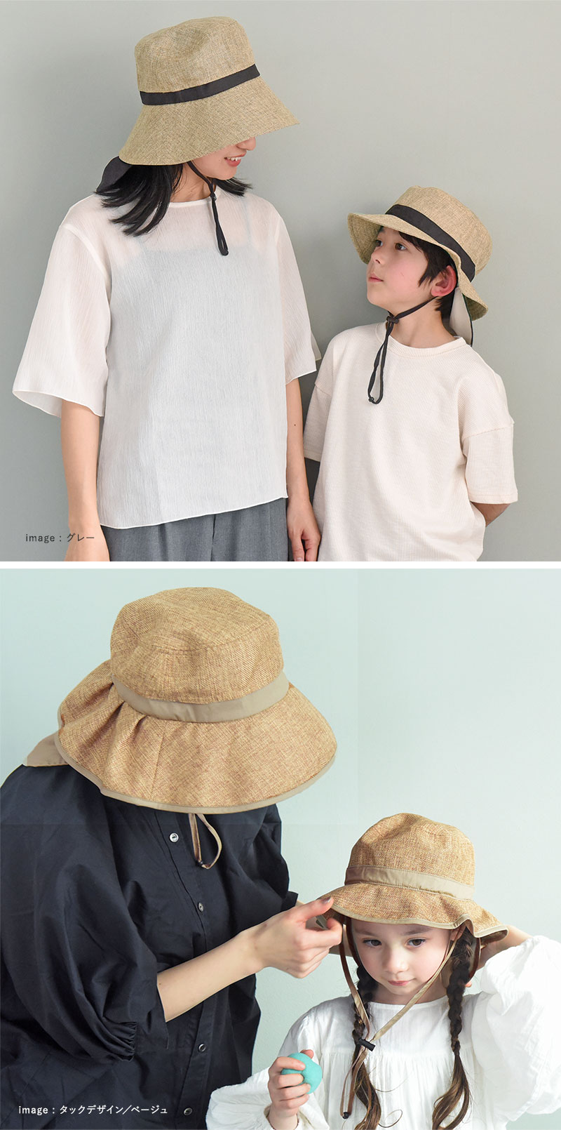 「キッズのジュート風帽子」と同じ素材を使用しているので、親子でお揃いコーデをすることも。同じ色で揃えるのもよし、違う色で楽しむのも◎です。