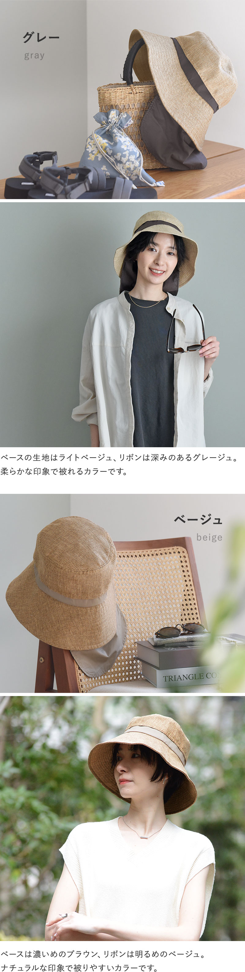 カラバリは全部で4種類。あご紐や日よけタレ部分をリボンのカラーと揃えて、統一感のある印象にしています。