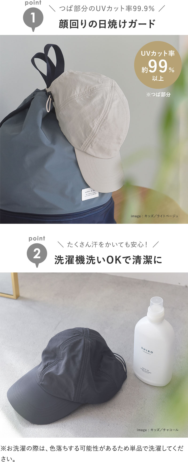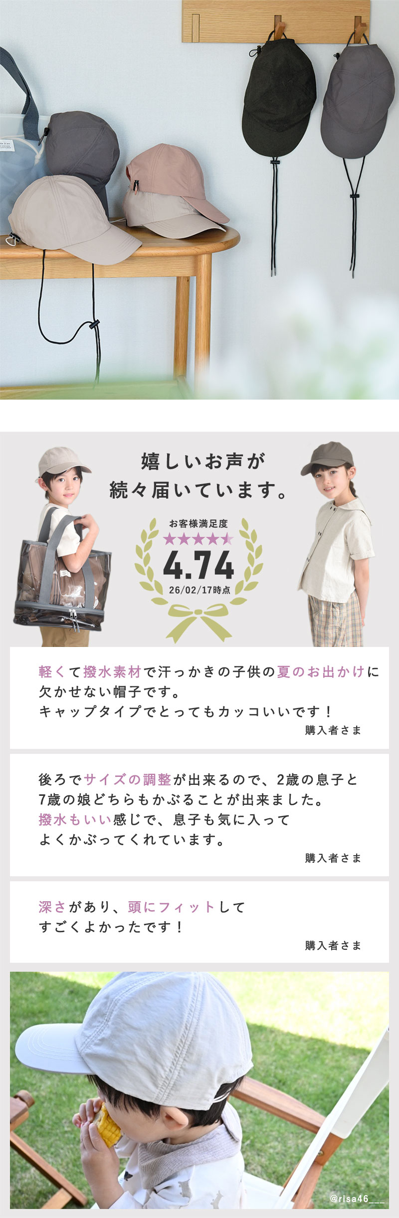 水に濡れても安心なこちらのキャップ。「撥水等級4級」のナイロン生地を使用しているため、プールや海・川や公園の水場で遊ぶ時など、アクティブなシーンにぴったりです。
