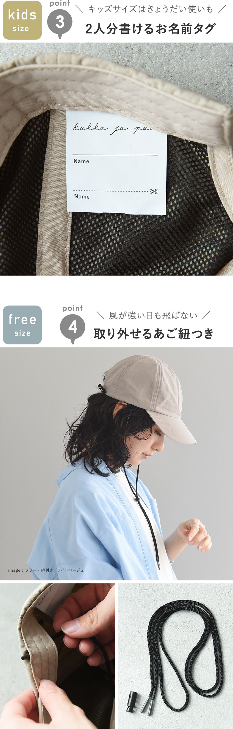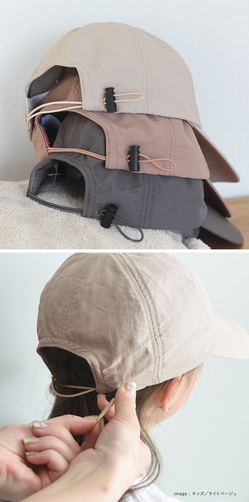 帽子の後ろにドローコード(ゴム)が付いているので、サイズを調整しながら長く愛用いただけます。被った後にきゅっと絞るだけの楽ちん仕様で、キッズも比較的簡単に調整ができます。