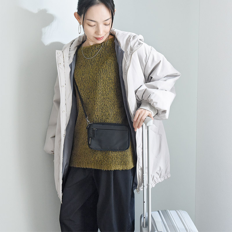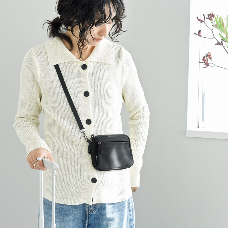 サコッシュタイプのこちらは、家族全員分のパスポートが収まる容量がポイント。現金が入るファスナーポケットやカードポケットも付いているので、個人の利用にも便利です。