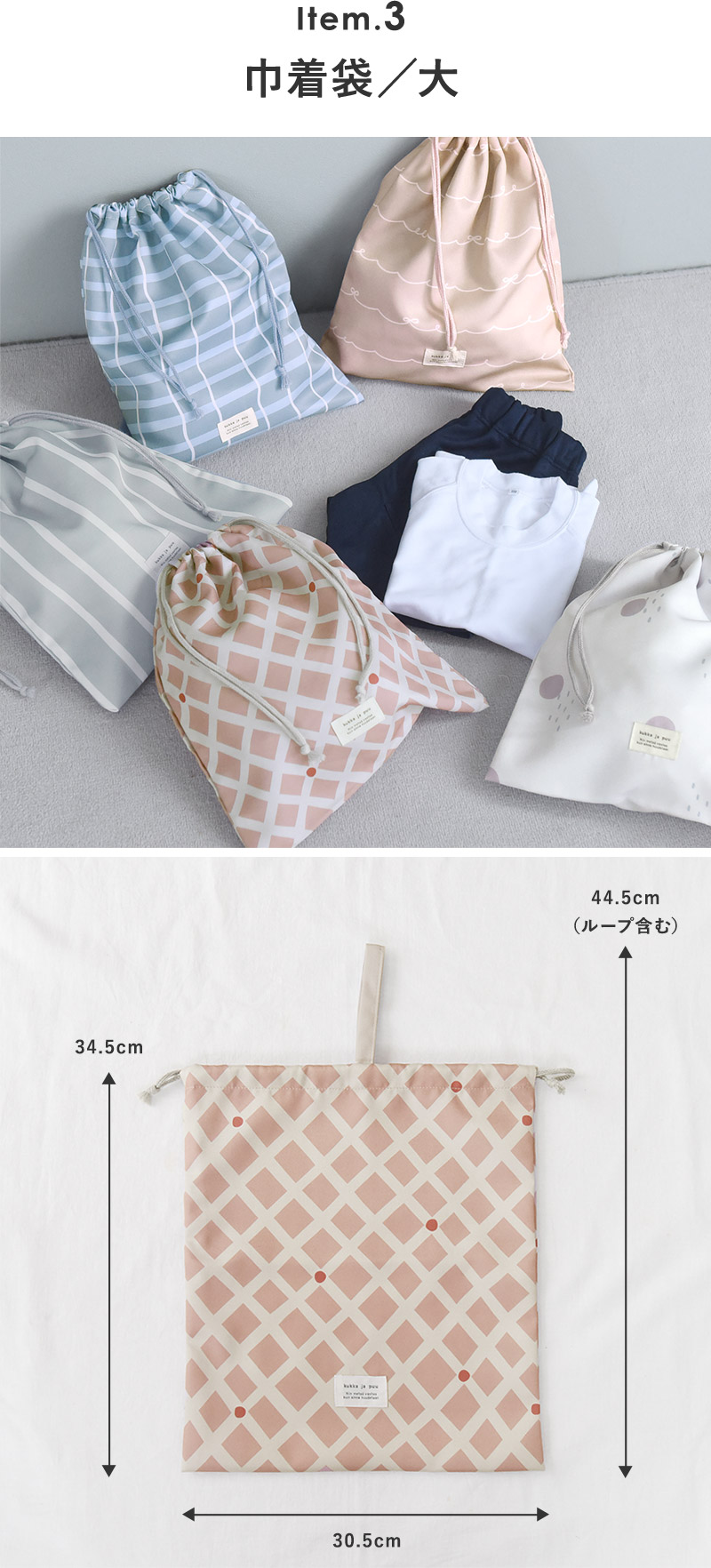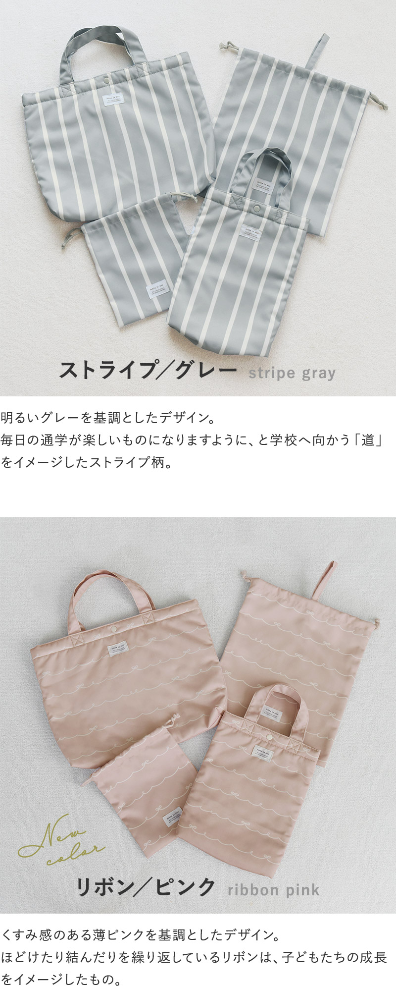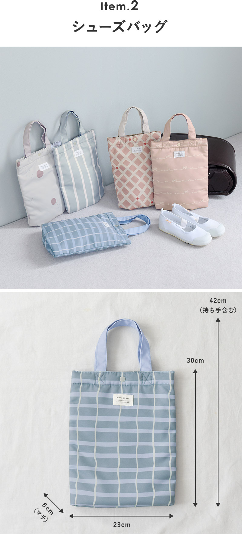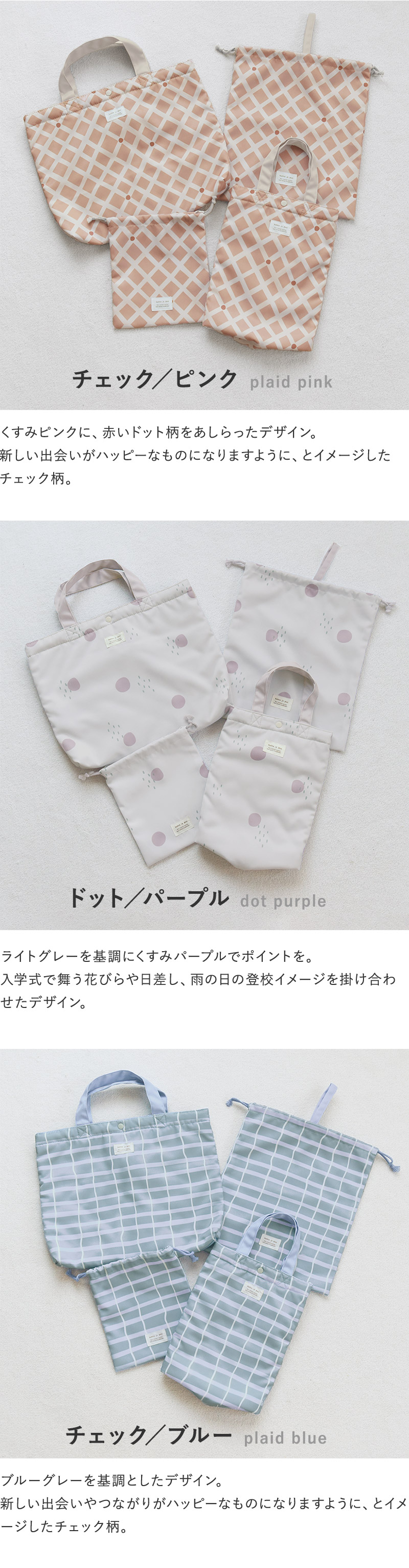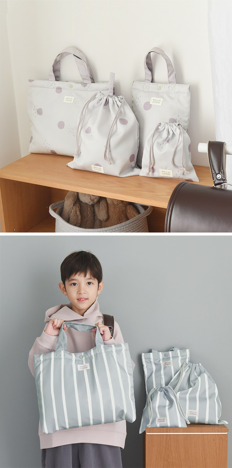 入園・入学準備にまず揃えておきたい、4アイテムのセットです。同じ素材&カラーで持ち物を揃えれば、お子様にとって「これが自分の!」と分かりやすい目印に。コーディネートの統一感もアップします。