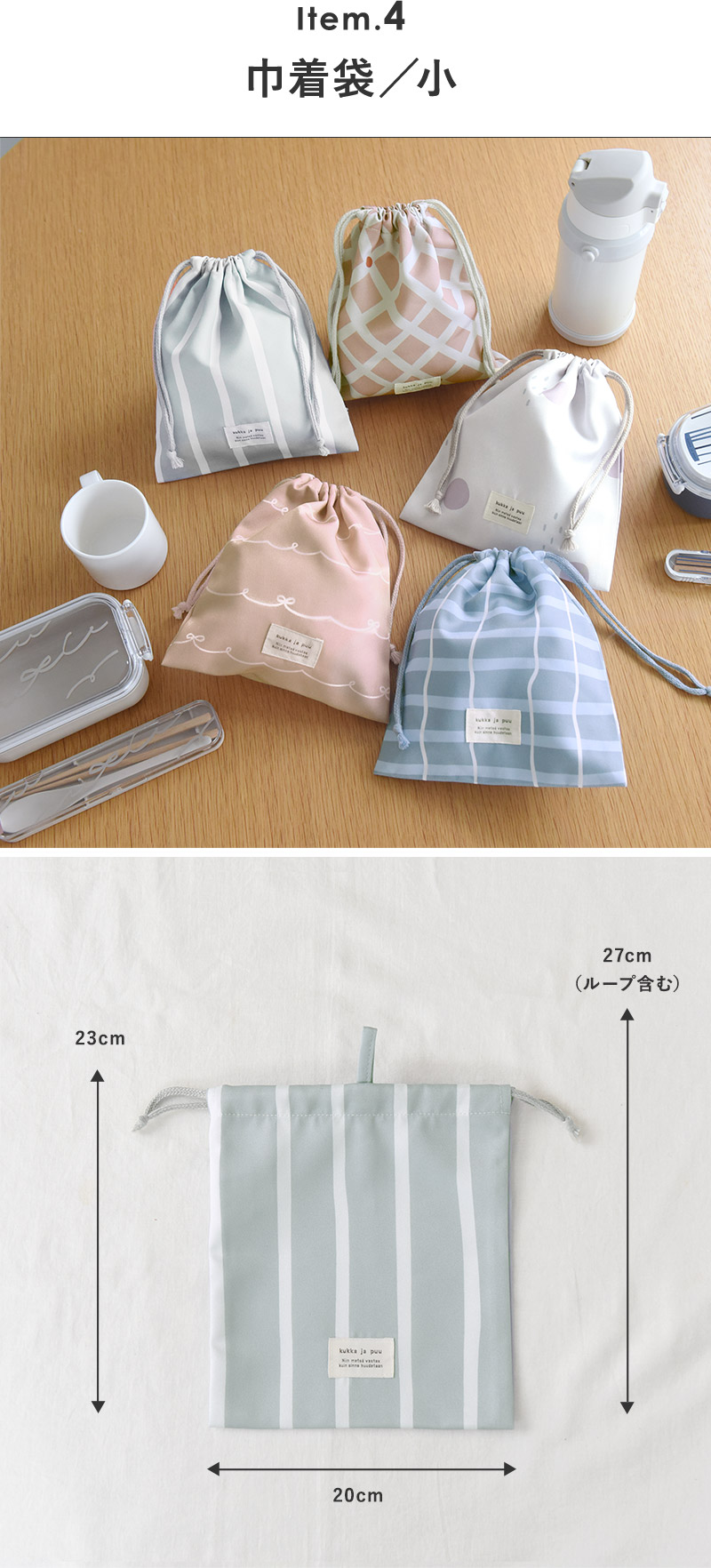 コップやランチョン入れに園で使うコップや、学校給食で使うランチョンマット入れにちょうどいい、小さめサイズの巾着。ランドセル横のフックに掛けやすい、短めのループも付いています。