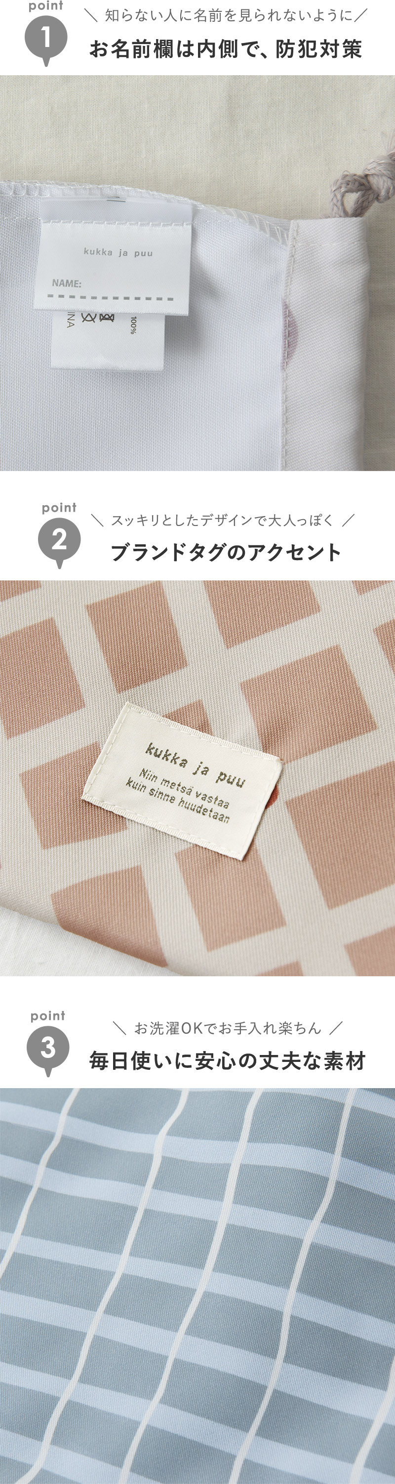 kukka ja puu(クッカヤプー)のオリジナルで作った、北欧テキスタイル風アイテムたち。こちらは入園入学準備に必要となる「レッスンバッグ」、「シューズバッグ」、「巾着大(体操着入れ)」、「巾着小(ランチョン入れ)」の4点セットです。