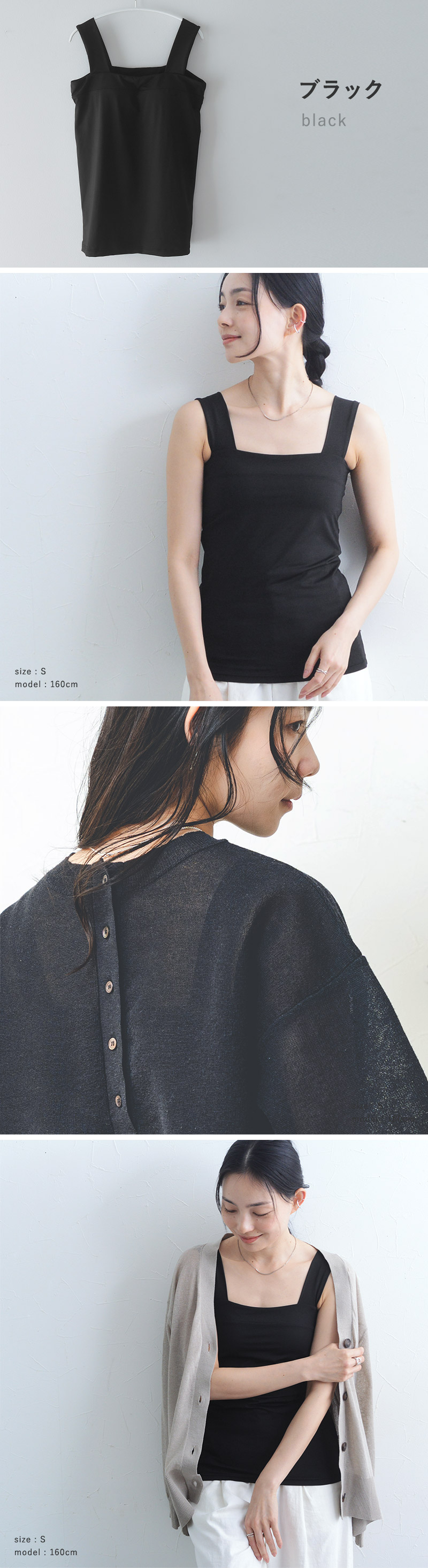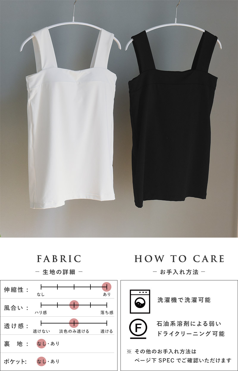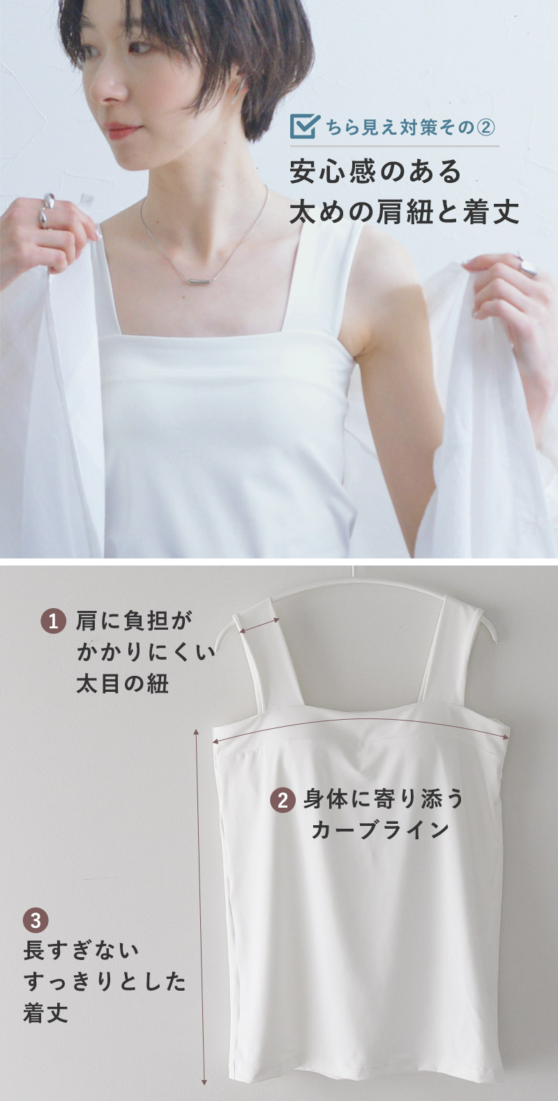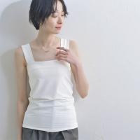 1:肩に負担がかかりにくい太めの紐肩紐はスクエアタンクトップと同じく、安心感があり肩に負担のかかりにくい太めの幅。トップスからチラ見えしてもインナー感がないデザインになっています。