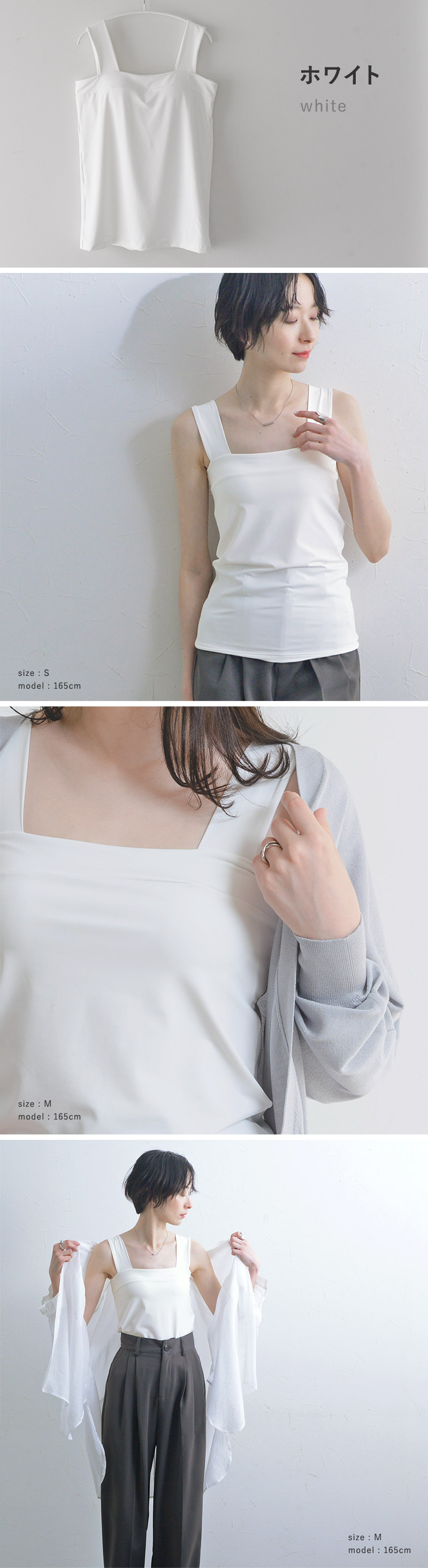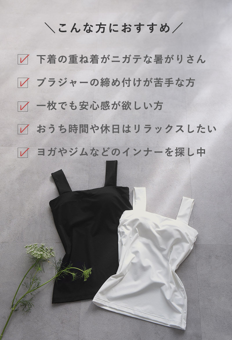 肩紐からブラ紐がチラ見えする心配もゼロ。トップスの下にこちらを1枚着るだけでOKだから、暑い夏にも最適です。