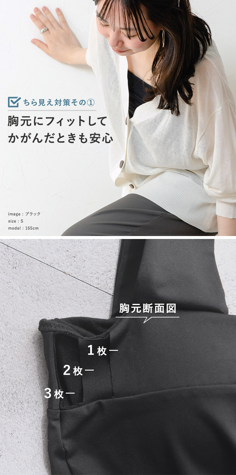 こだわりの3枚仕立て。フィットする胸元胸元の切り替え部分は3枚仕立て。しっかりとした生地感で、バストの上部にもぴったりフィットしてくれるので、かがんだ時の胸元チラ見えの心配も軽減します。