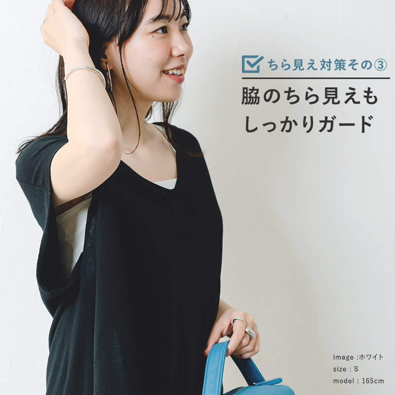 透け感トップスと重ねるコーデにもぴったり。ネックやアームホールが大きく開いた夏服の下に、一枚着たいお守りタンクトップです。