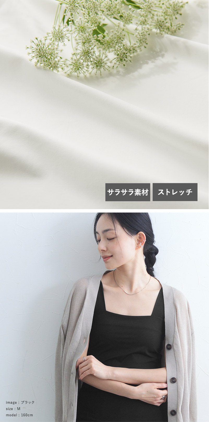 光沢を抑えた質感だから、チラリと見えても下着感がですぎず、上品見えする素材です。