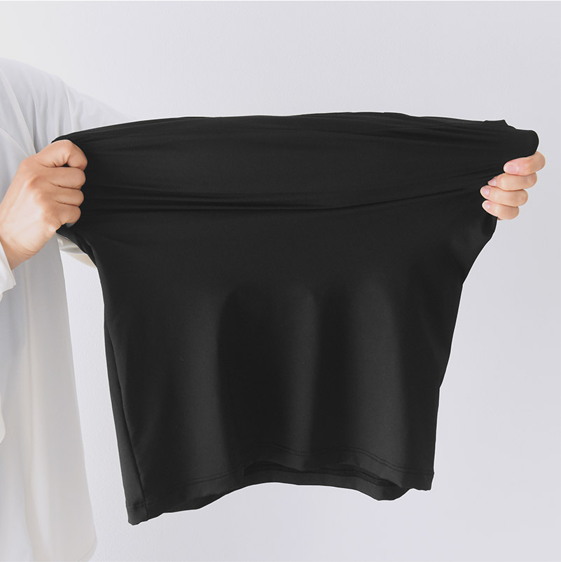 すべすべサラサラで気持ち良い素材はナイロン85%、ポリウレタン15%。つるんとした肌触りで滑りも良いので、インナーとして最適。