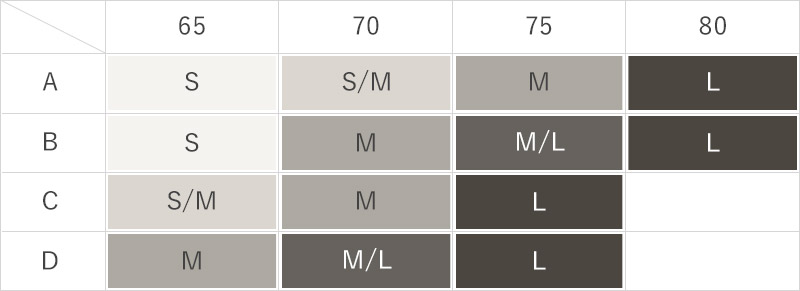 SサイズからLサイズまでの3サイズ展開に。普段着用されているブラジャーのアンダーやカップをご参考にお選び下さい。