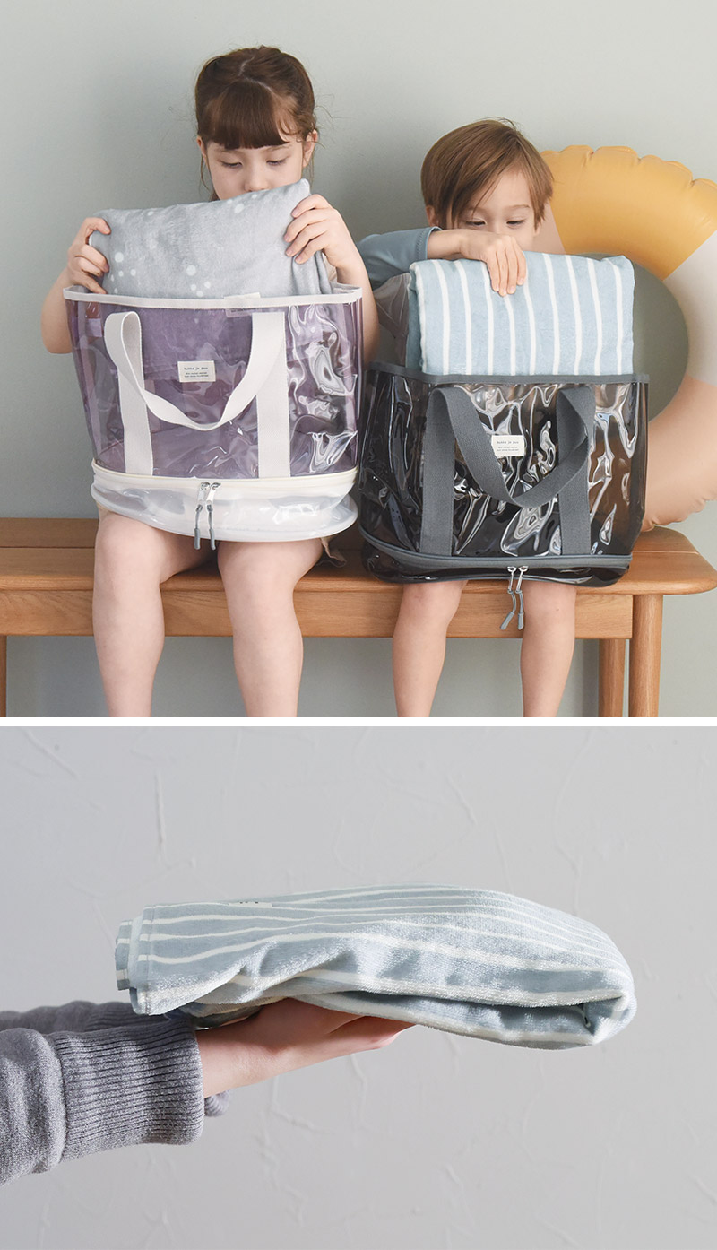 プールバッグの中で嵩張りにくい薄さながら、表面はふわっとやさしく、裏面は吸水性のよいループパイルで快適に。