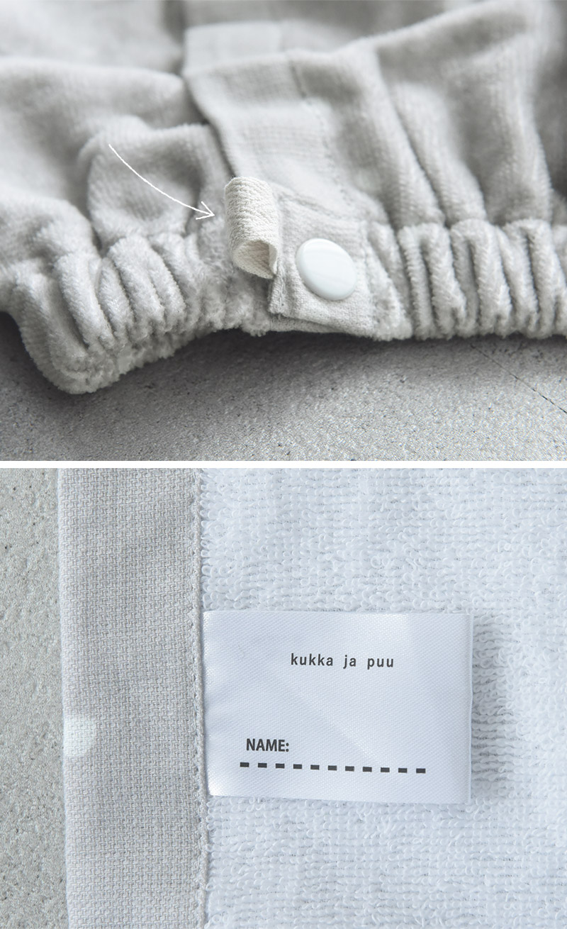 2段階で調整できる首元キッズの体型に合わせて調整できるように、首元に2段階のスナップボタンをつけました。使いやすいだけでなく、タオル地と異なる色のスナップボタンがほんのりアクセントにも。
