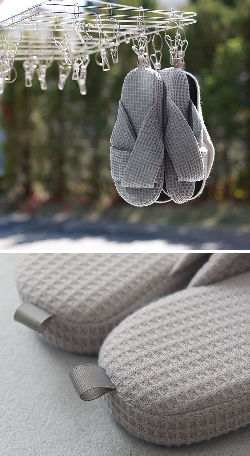 洗ったあとのスリッパを型崩れせずに干せるように、かかと部分にループをつけました。洗濯ばさみでつまんだり、フック等にかけて干すことができます。