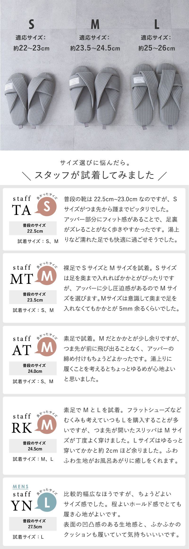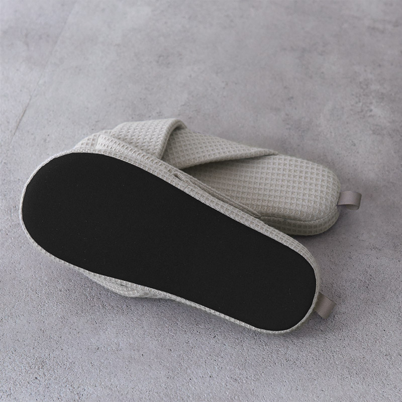 「湯上りスリッパ」と名付けたこちらは、凹凸感のあるワッフル織りにより、足の水分をすっと吸収。その後もさらりとした肌当たりが続く快適スリッパです。
