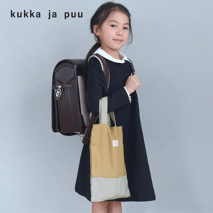 落ち着いたトーンの2色の無地×裏地に表面感のあるボーダー素材をあわせ、さり気ないタックのアクセントで北欧テイストの仕上がりに。kukka ja puuのタグが、少し大人っぽさを添えています。