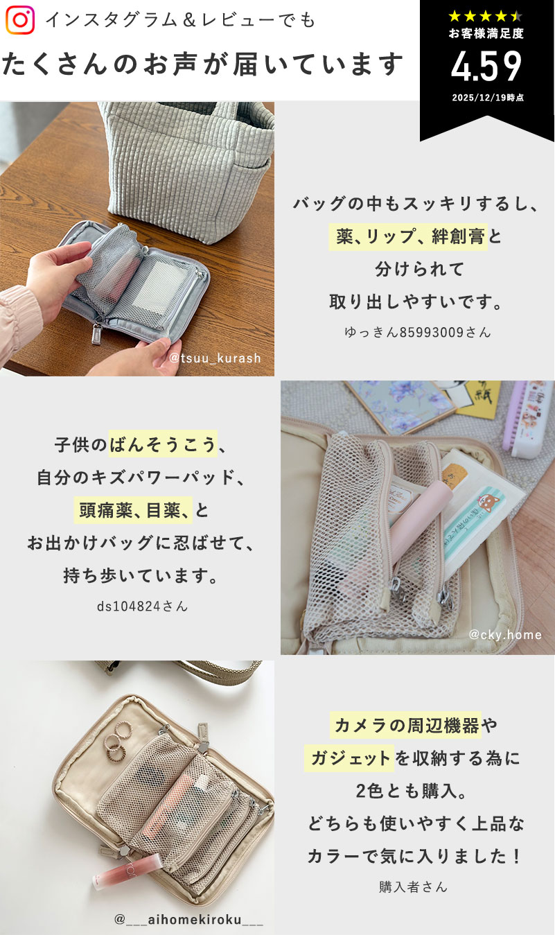 中には4枚のメッシュポケットがあり、ページをめくるようにパラパラと中身を確認できるのが◎。これなら薬・コンタクト・充電ケーブルなどのあらゆる小物が一つにまとまり、すぐ見つけられます。