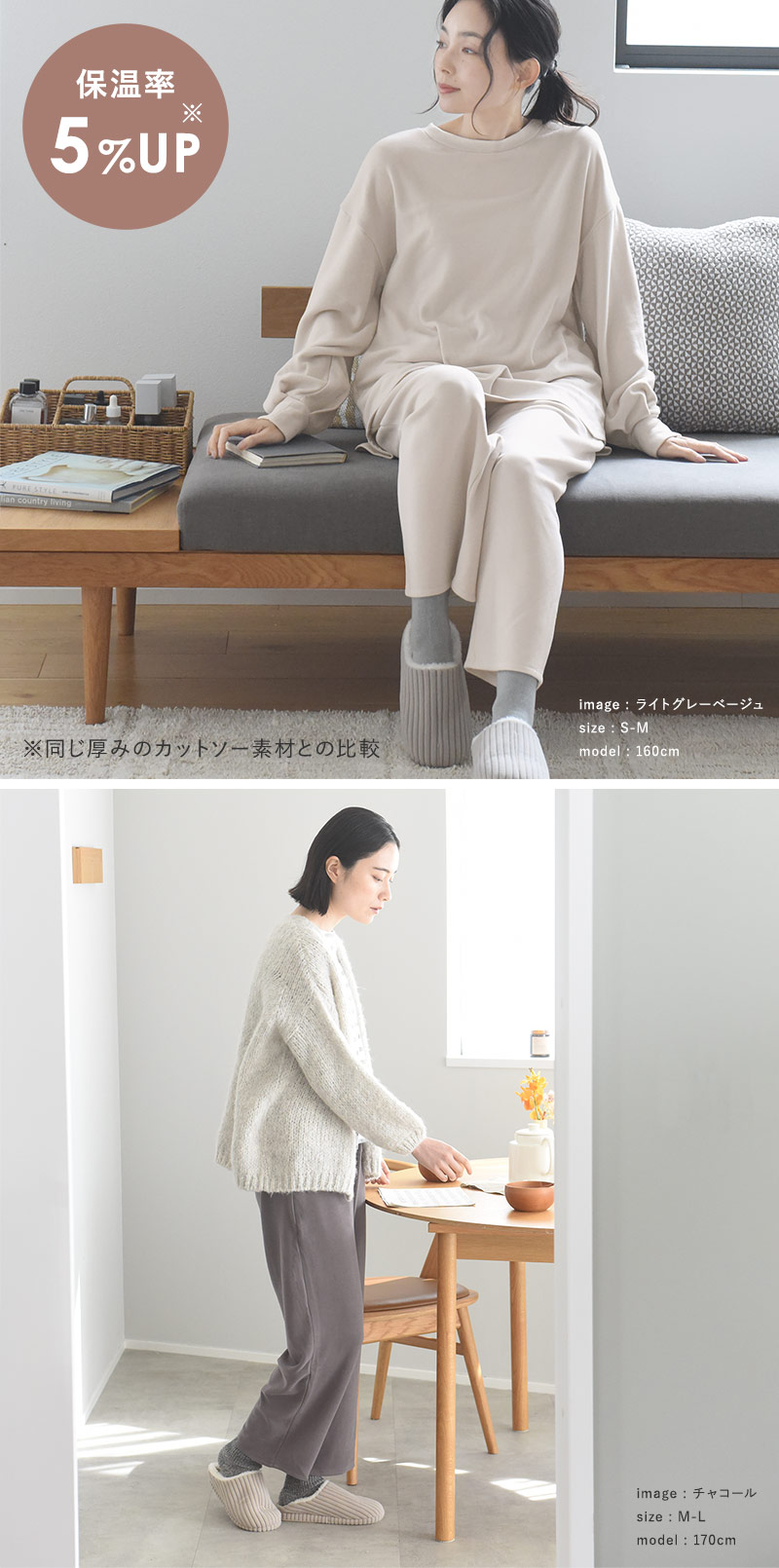 シンプルなルームウェアですが、着てみると実感するのはその着心地の良さ。ウールによく似たアクリル混素材で作られていることで、じんわりあたたかいのが特徴です。