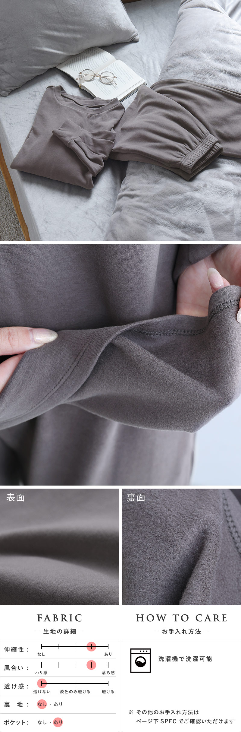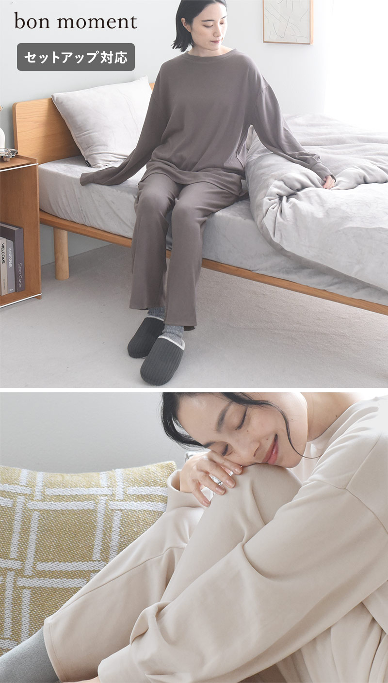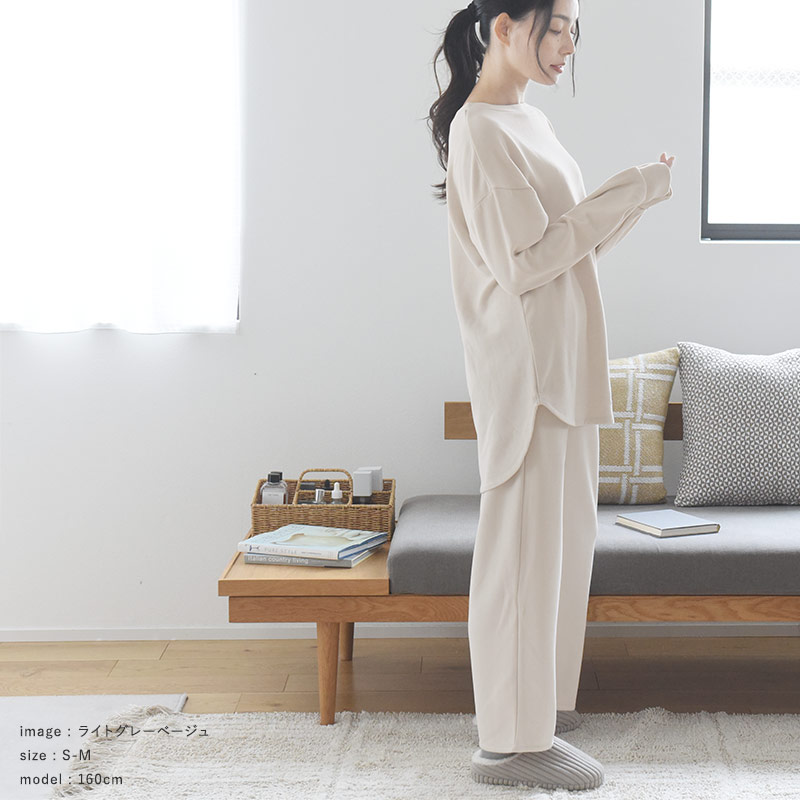 着心地が良いことはルームウェア選びで大切なポイント。こちらは、レーヨンがブレンドされていることでしっとり柔らかな肌心地。また、あたたかみのある微起毛素材で穏やかなぬくもりを感じます。