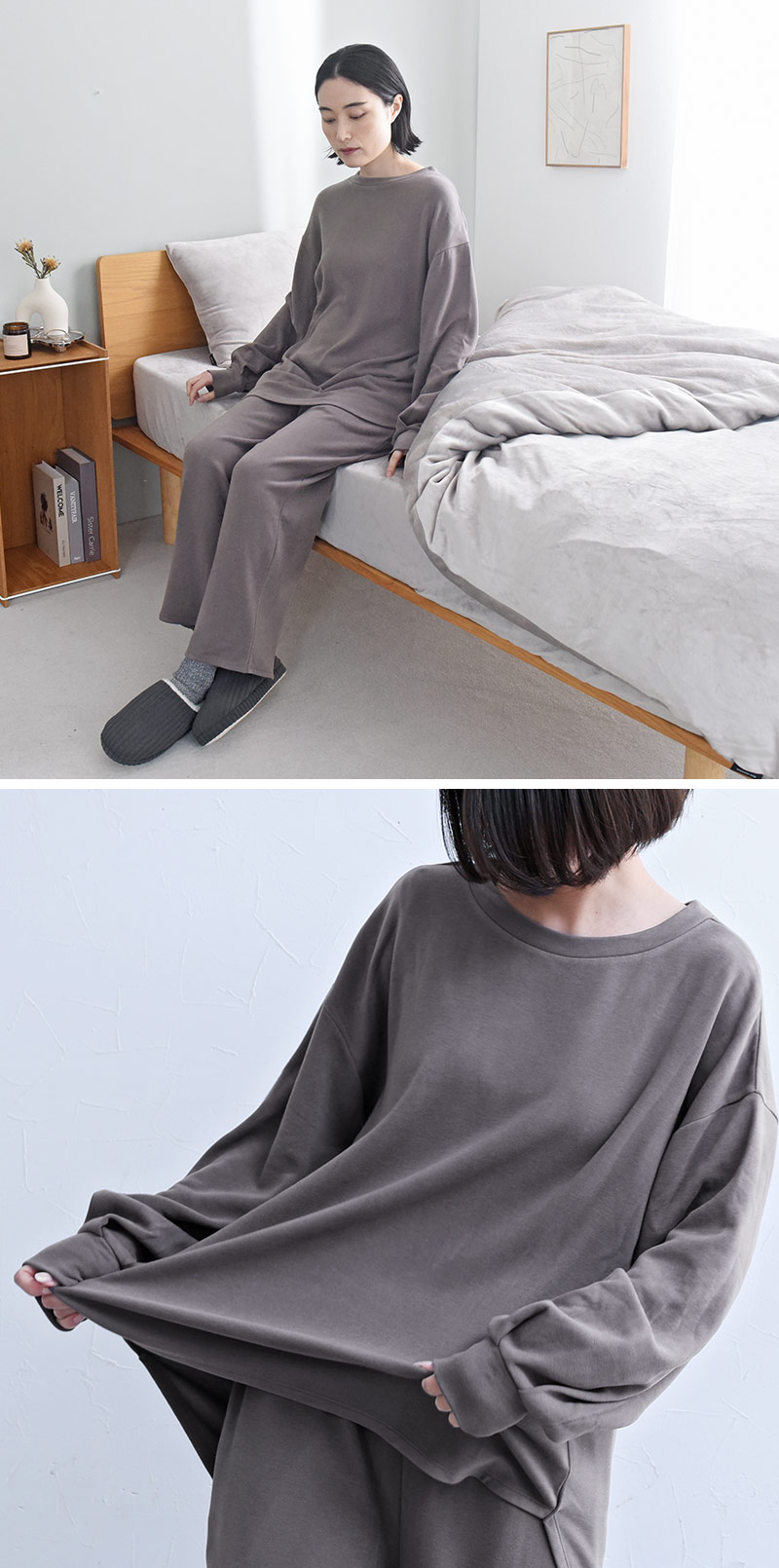 同素材のチュニックとセットアップ使いも◎。同色で揃えるのも、あえて違う色であわせてもOK。ふんわりあたたかなウェアで上下を揃えればさらに心地よく過ごせそうです。