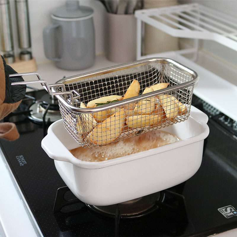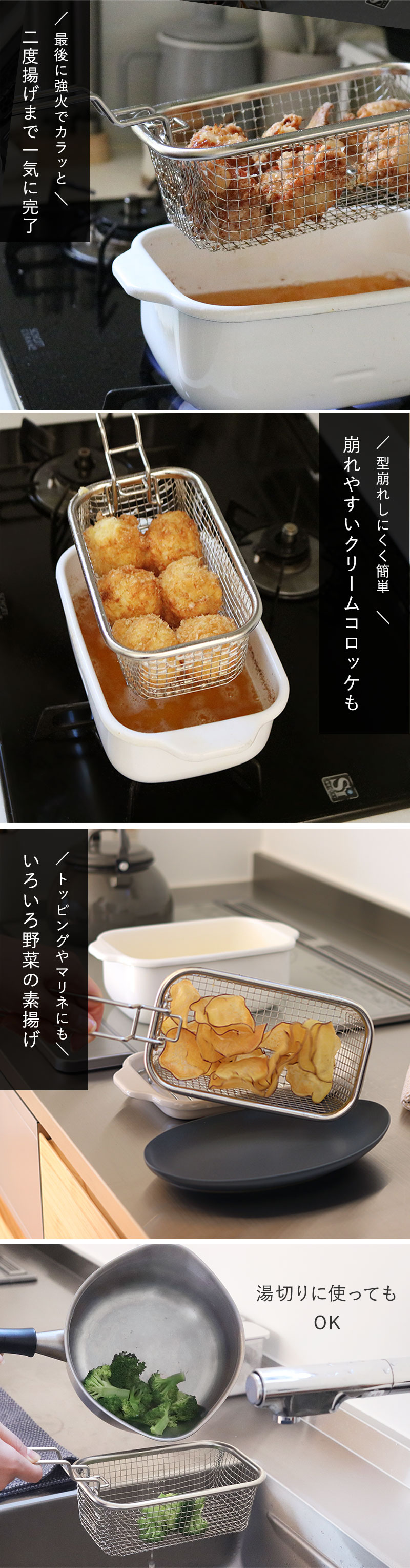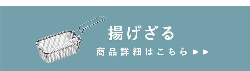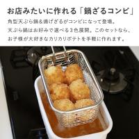 角型天ぷら鍋にぴったりフィットする、揚げざるをセットでご用意。お家ポテトにからあげ、野菜の素揚げも◎、一気に揚げることができてカラッと美味しく仕上がります。