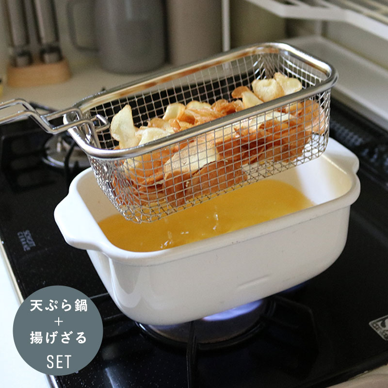少量の油で揚げられて、手軽に使えるとご好評の富士ホーロー「角型天ぷら鍋」と、角型鍋にぴったりフィットする「揚げざる」がセットになって登場しました。
