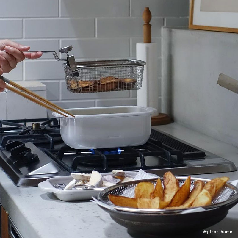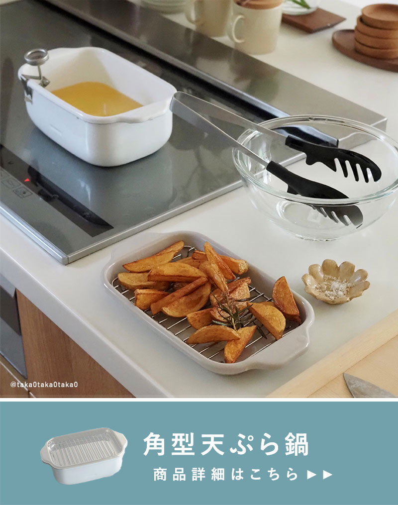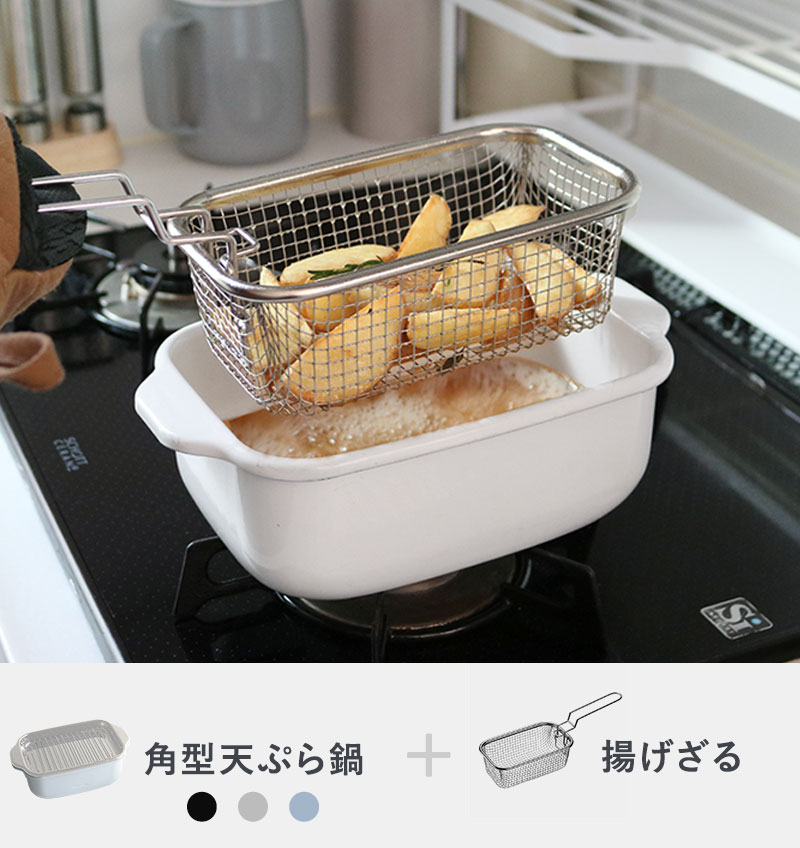 角型天ぷら鍋&揚げざるがコンビになって登場しました。天ぷら鍋はお好みで選べる3色展開。このセットなら、お子様が大好きなお店のカリカリポテトをお家で手軽に作れます。