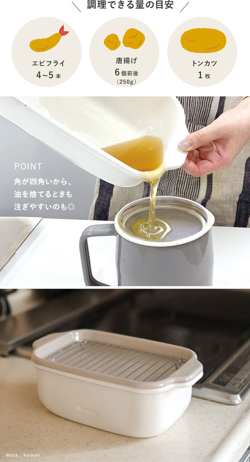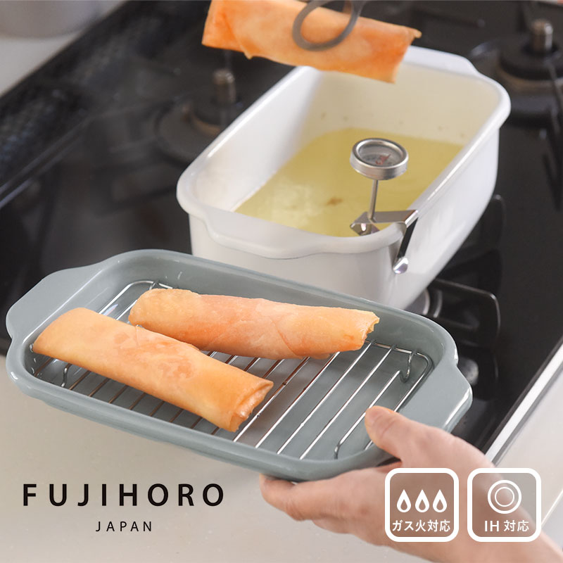 コンパクトなかたちや使い勝手の良さから人気を集める富士ホーローの角型天ぷら鍋。少量の油でも熱効率がよいのでカラっと揚げることができます。